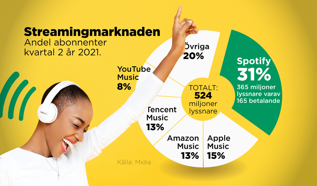Men även om Spotify är störst har Midia de senaste två åren sett en trend där bolaget börjat tappa marknadsandelar. Det har stadigt tickat nedåt från 34 procent av världsmarknaden 2019, till 33 procent 2020 och 31 procent 2021.