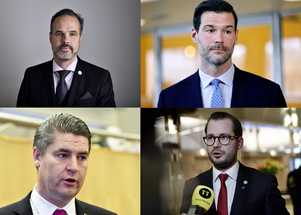 Henrik Montgomery, Stefan Jerrevång, Stina Stjernkvist / TT: Överst från vänster: Eric Westroth, politiker, riksdagsledamot för Sverigedemokraterna, Johan Forssell, Moderaternas rättspolitiska talesperson, Oscar Sjöstedt, Sverigedemokraternas ekonomisk-politiske talesperson, Mattias Bäckström Johansson, riksdagsledamot för Sverigedemokraterna. Arkivbild.