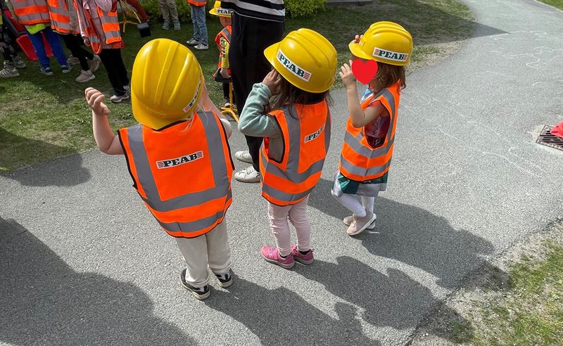 Barnen blev byggare för en dag när en grävskopa kom lastat med grävmaskiner och frontlastare i miniformat. Peab tillsammans med kommunalrådet Annette Carlson pratade lite kort med barnen, som hade firat förskolans dag på förmiddagen. Barnen informerades om att det strax skulle komma en överraskning. När hjullastaren kom inkörandes på förskolans parkering fullastad med västar, hjälmar, grävmaskiner mm så skrek barnen av lycka.