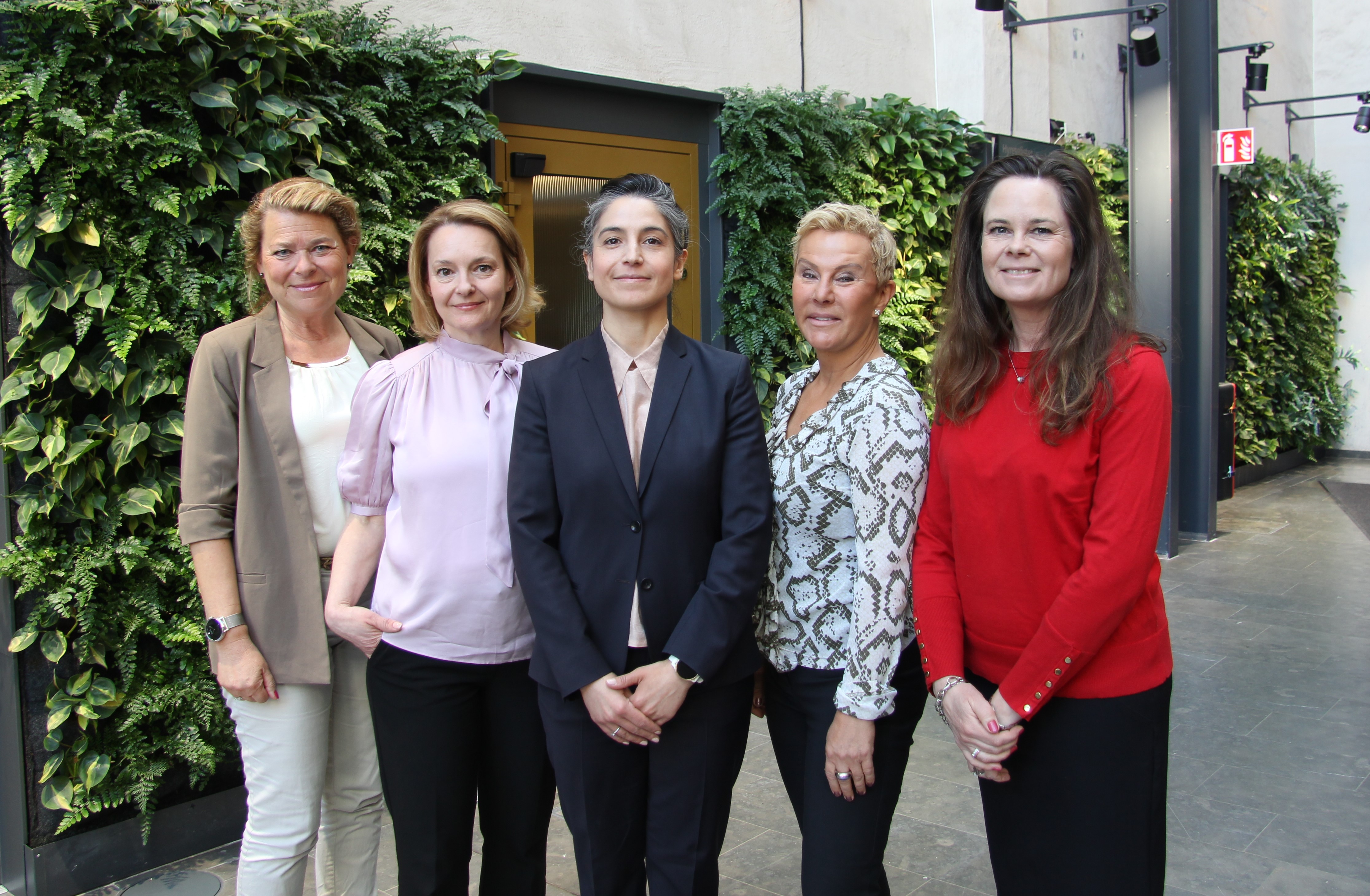 Från vänster: Anita Hagelin, Plåt & Ventföretagen, Irena Franzen, Ledarna, Nikita Nabavi, Unionen, Ragna Boustedt, Sveriges Ingenjörer och Karin Wiberg Stålbröst, Plåt & Ventföretagen. Foto: Plåt & Ventföretagen