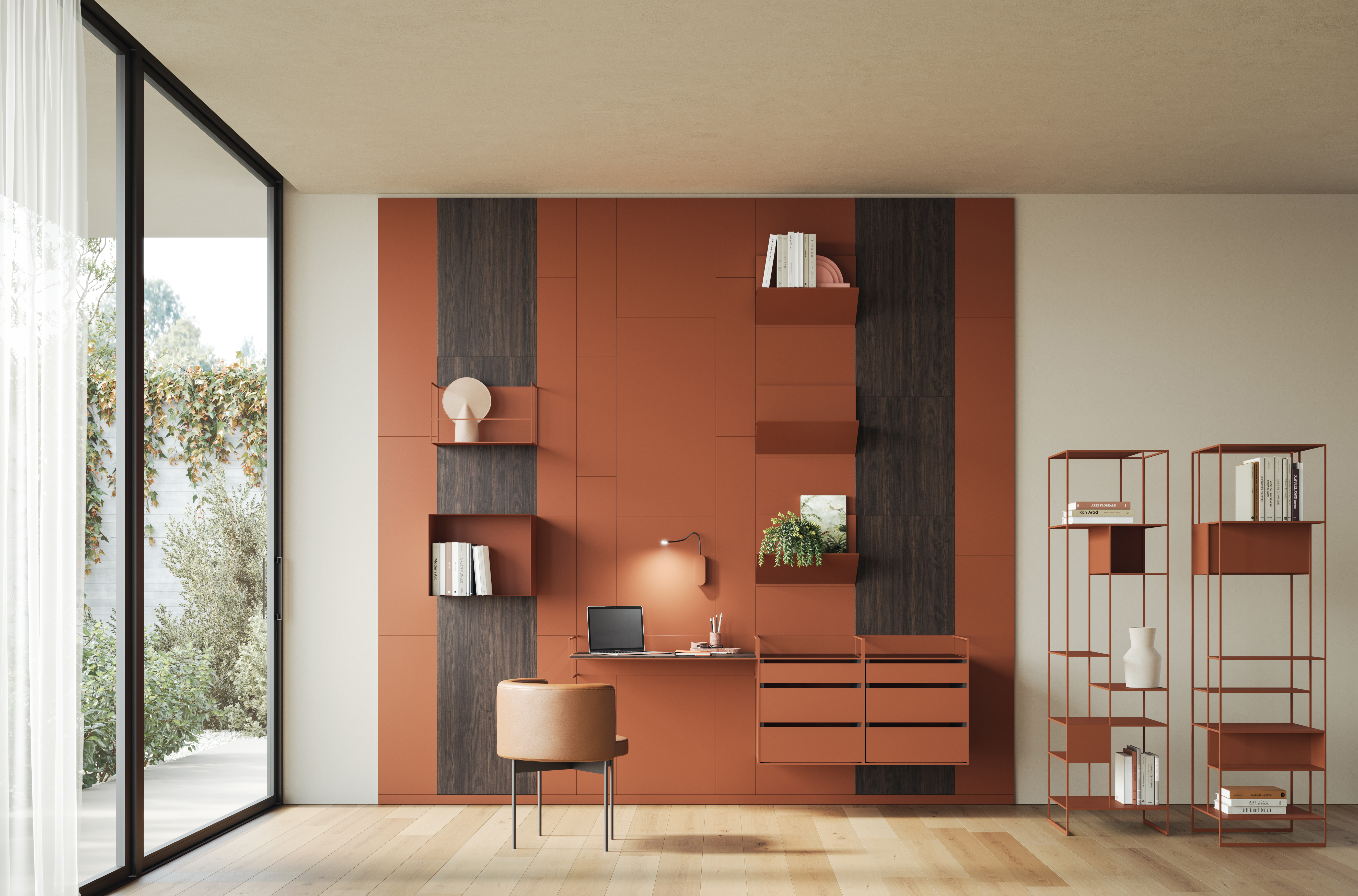 Minimalistiska drag och luftiga linjer samverkar i Levia Stand, den fristående bokhyllan i lackerad metall designad med 10 mm fyrkantiga profiler.