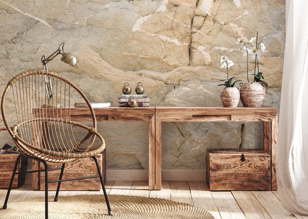 Texturerade väggar och tak kommer också att ses i hemmen. Ett kostnadseffektivt sätt att uppfylla denna trend är att introducera väggmålningar med konstgjord textur. Effekter av tegel, sten, marmor och betong blir allt populärare enligt Wallsauce.