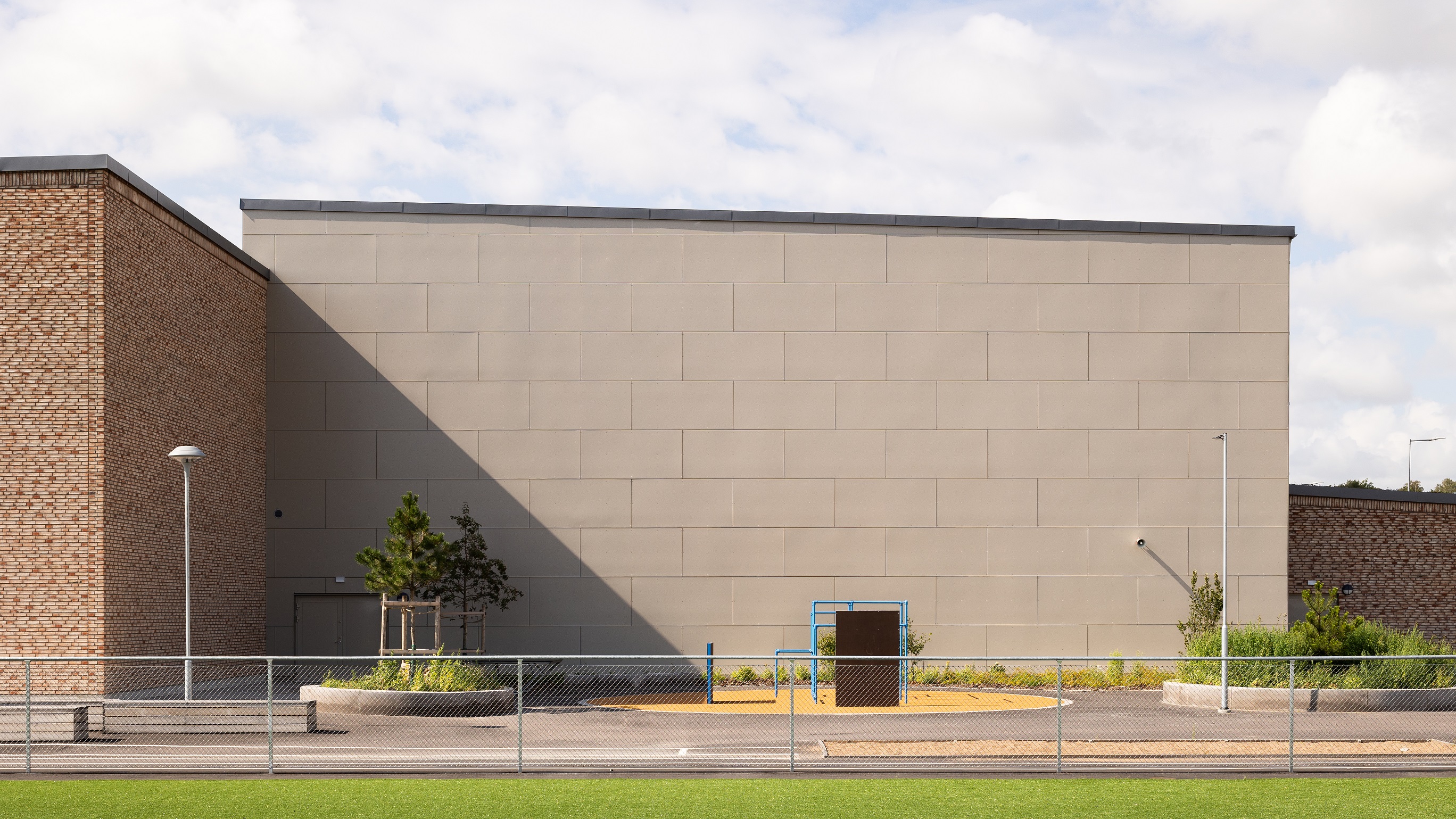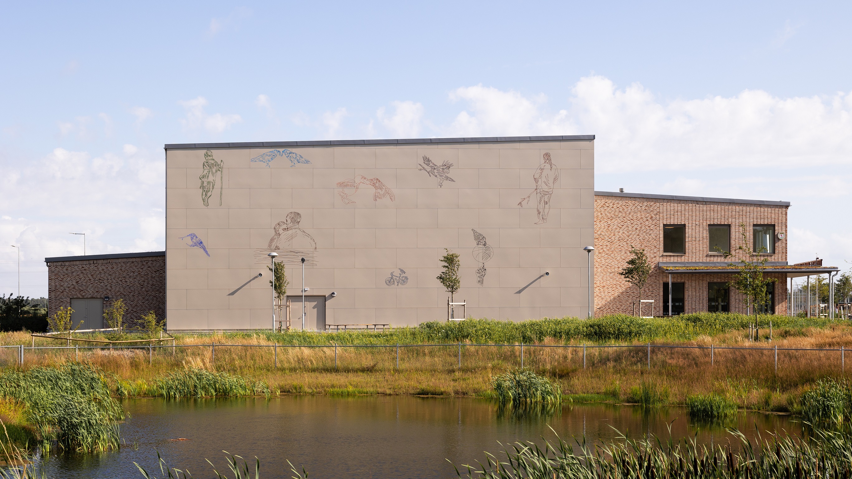 Konstnärliga fasader ger liv åt Falkenbergs nya idrottshall