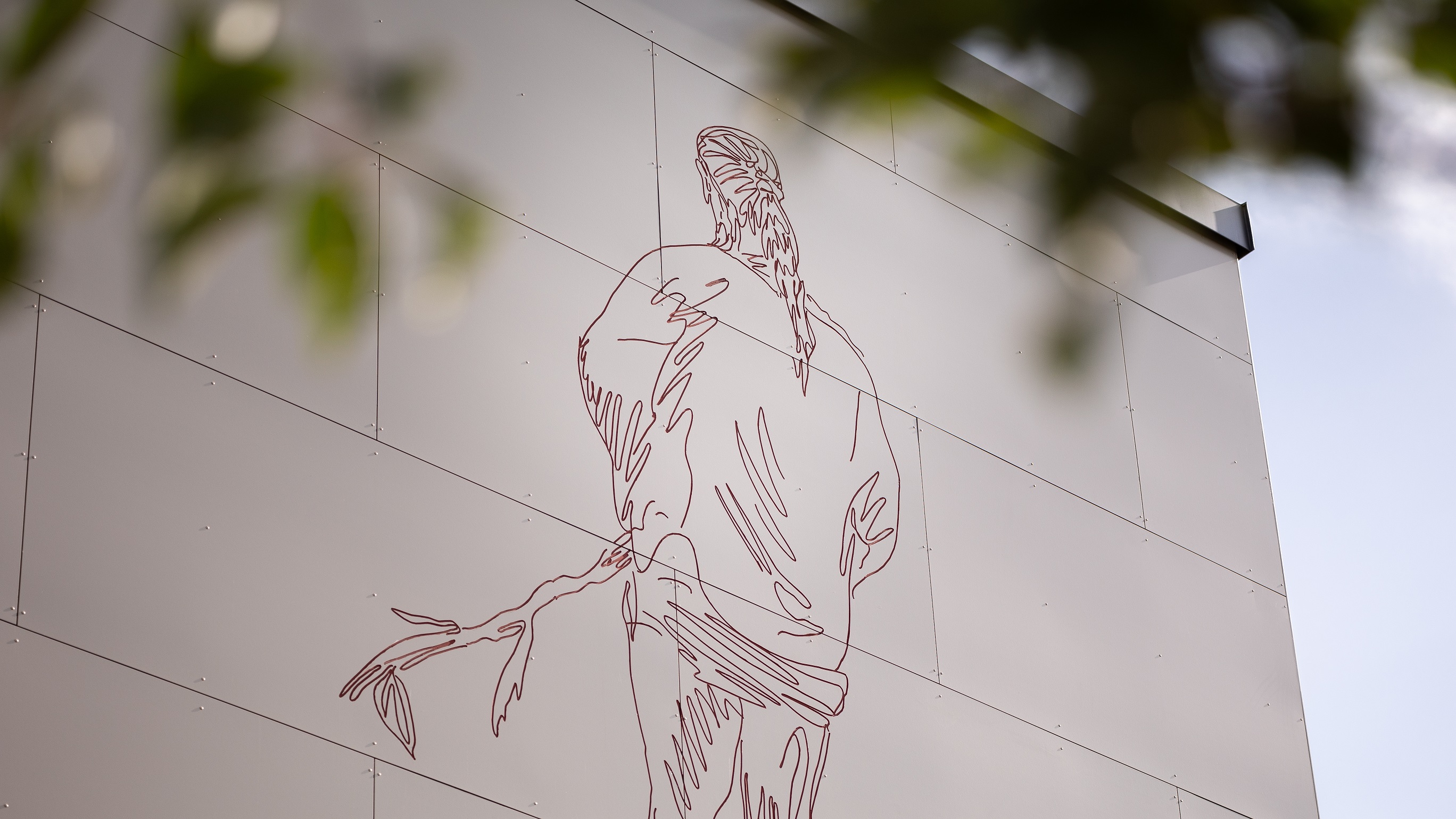 - Sedan hade jag en dialog med Creforma om hur man kunde prägla in mina motiv i fasaden. Jag lämnade därefter in digitala teckningar till dem och hade samtidigt dialog med kommunen om motiven. Efter att de hade monterats fick jag måla in linjerna direkt på fasaden, så att motiven får olika färger. För mig var det viktigt att se hur jag kunde översätta uttrycket i fasaden och materialet, och resultatet blev jättebra. Det ser verkligen ut som att någon har tuschat på fasaden, vilket var målet. Det är dessutom fint att se konstverkens färger bryta med färgen på Rockpanels fasadskivor.