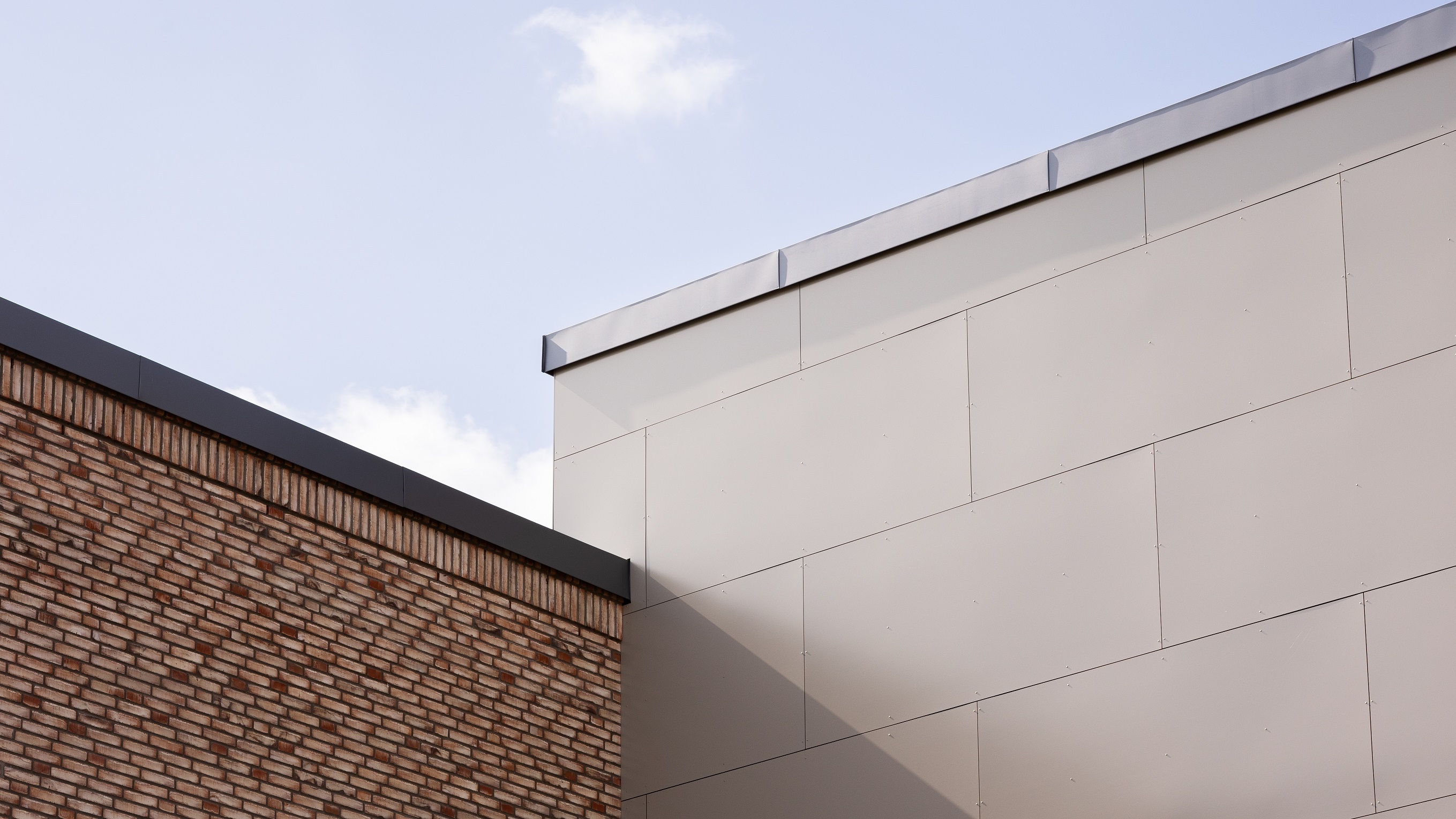 De ljusa ljusa fasadskivorna står i kontrast till de tegelklädda delarna av byggnaden. Foto: Rockpanel