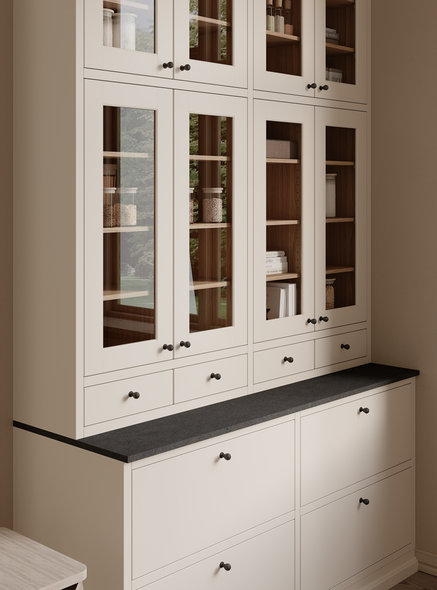 Glas används alltmer som dekorativt och funktionellt inslag, från räfflade ytor till transparenta hyllsystem och rökfärgade vitrinskåp. Glas ger ett luftigt intryck och möjliggör att kökets innehåll visas på ett modernt sätt, vilket gör att rummet känns öppet och visuellt intressant.