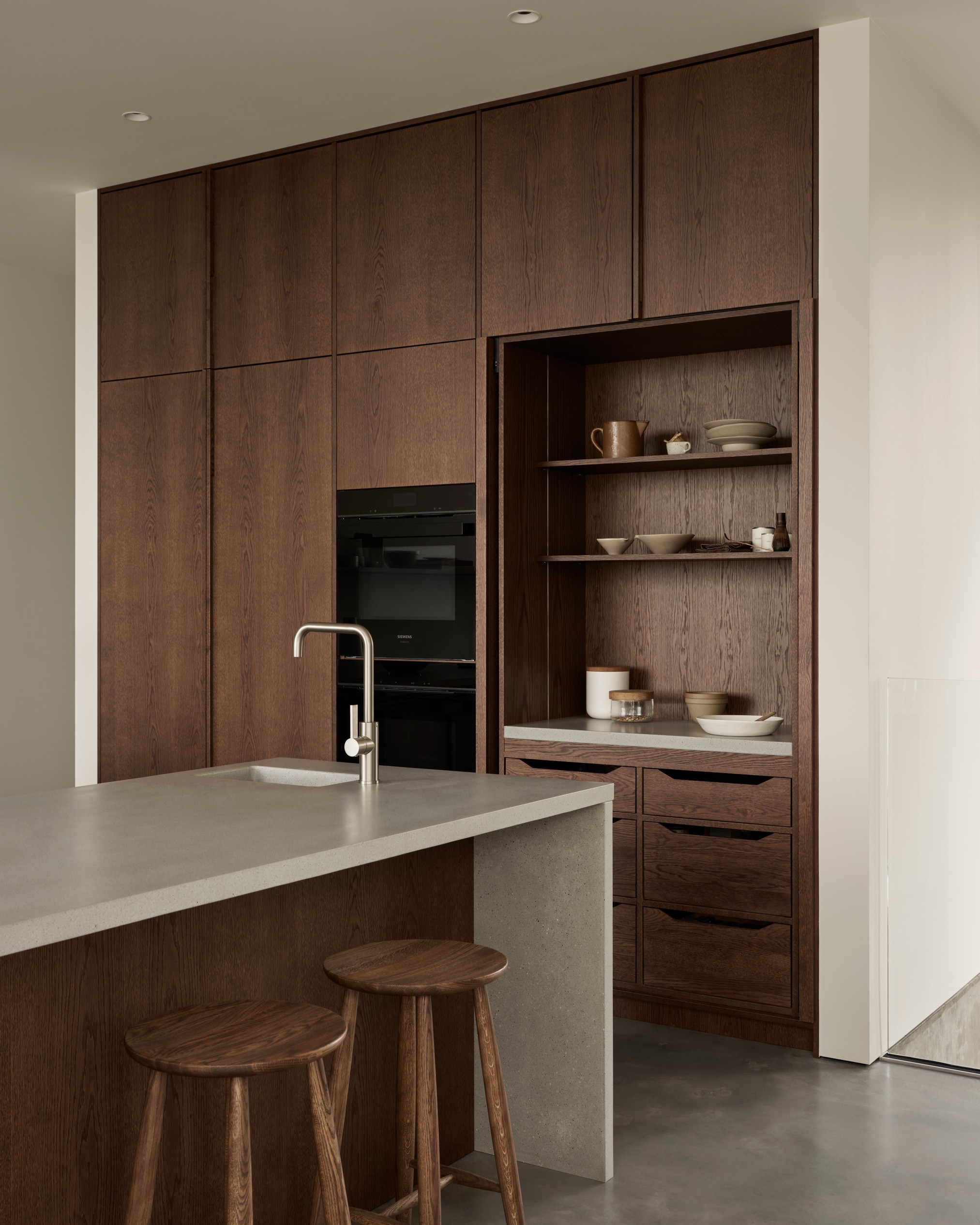Nordiska Kök har utformat och tillverkat den platsbyggda interiören i mörk ek, vilket inkluderar kök, badrum, förvaring och specialanpassade detaljer. Fokus har varit att skapa en helhet som harmonierar med husets arkitektur.