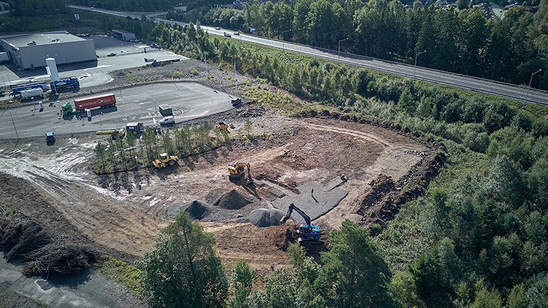 Så här ser det framväxande ladd- och tankcentret i Nässjö ut just nu. Till vänster i bild syns snabbladdarna som är i drift, och till höger byggs den nya tankstationen för biogas. Foto: Nässjö Näringsliv