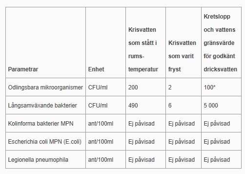 Resultat av laboratorieanalysen av krisvatten som lagrats i ett år.