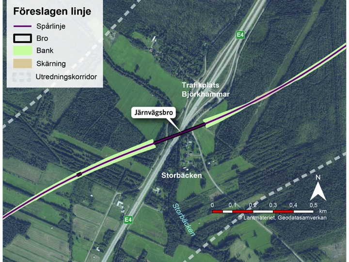 Linjen passerar berg och odlingsmarker med begränsad påverkan på landskapsbilden och korsar E4 vid Björkhammar med en gemensam järnvägsbro.