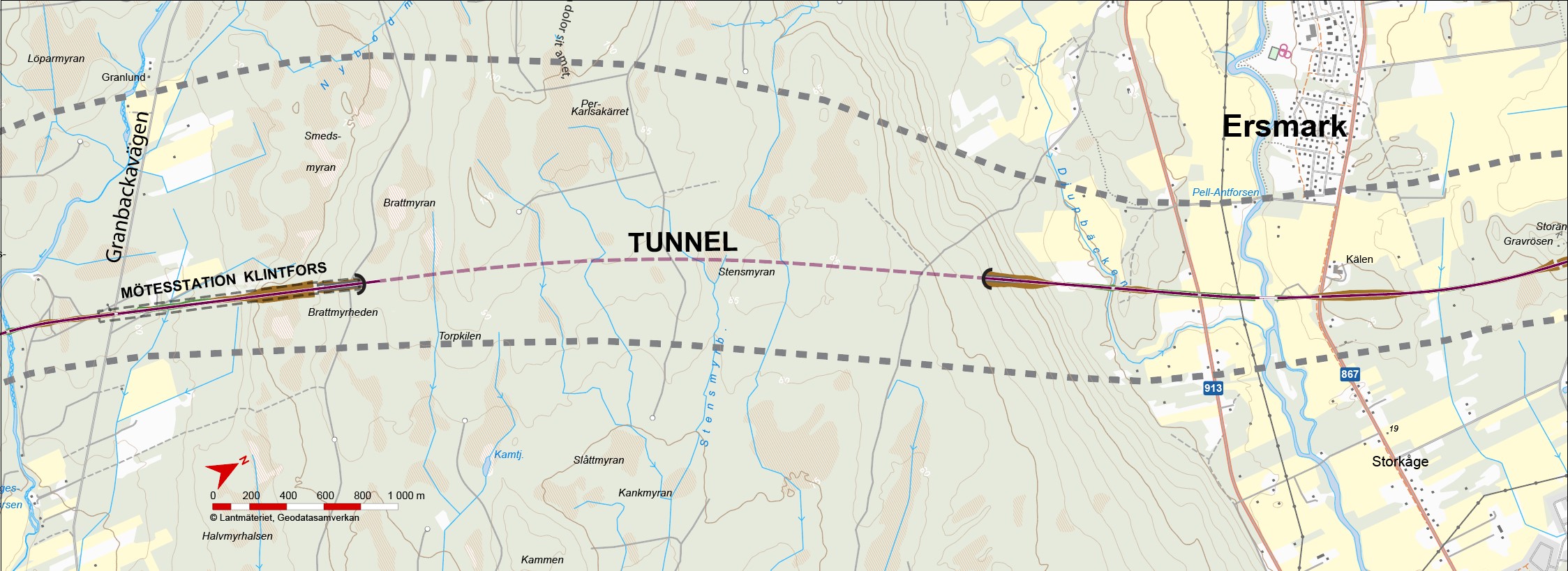 Sträckningen går genom en tre kilometer lång tunnel som mynnar ut söder om Ersmark.