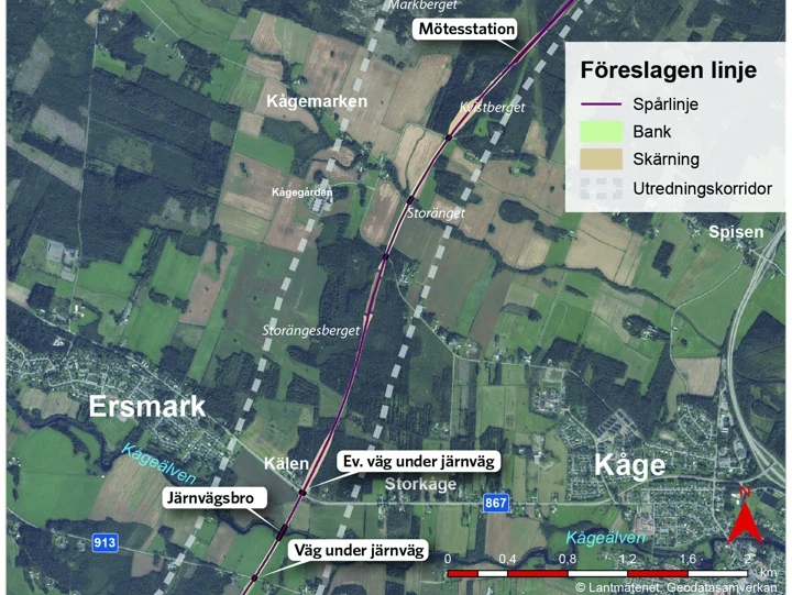Linjen dras cirka 500 meter öster om Ersmark, förbi Storängesberget, med mindre påverkan på boendemiljön och bättre grundförhållanden. Bild: Trafikverket