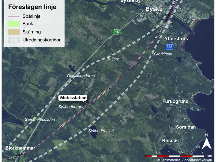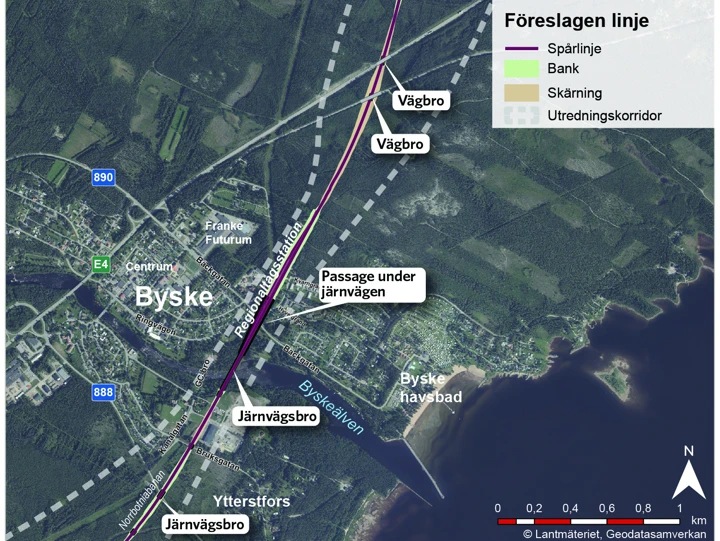 Järnvägen korsar Byskeälven med bro och en ny regionaltågsstation planeras på norra sidan av älven.