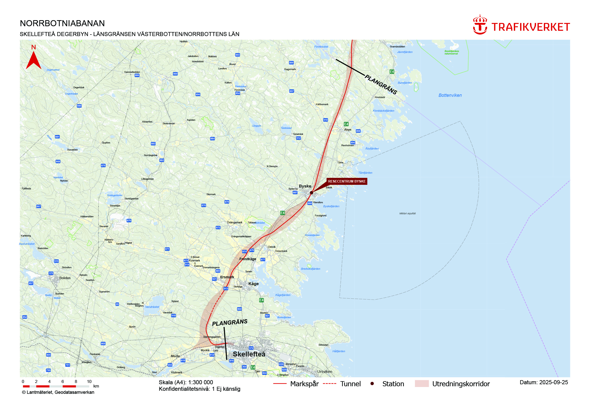 Trafikverket har beslutat vilken linje som ska ligga till grund för den fortsatta planeringen av Norrbotniabanan mellan Skellefteå Degerbyn och länsgränsen Västerbotten/Norrbotten. Förslaget är en kombination av tidigare alternativ och sträckningen går via bland annat Ersmark, Frostkåge, Ostvik, Byske och Åkroken innan den når länsgränsen.