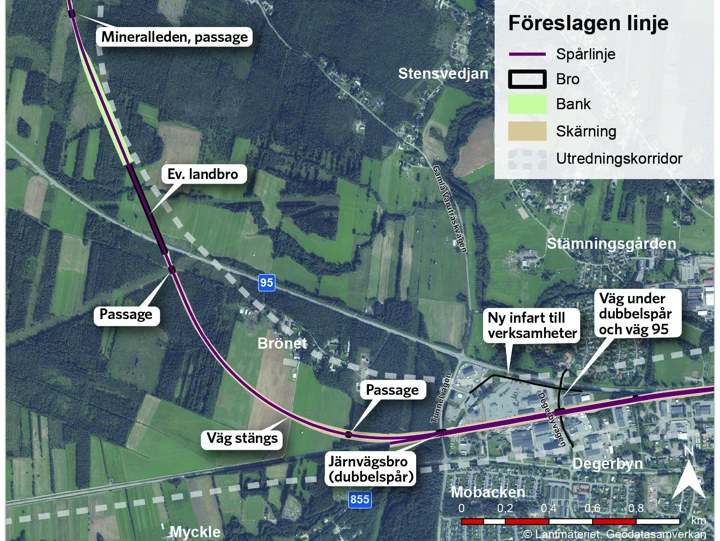 Utfarten Skellefteå. Linjen följer befintlig järnväg genom Degerbyns industriområde, passerar Brönet och väg 95, vilket minskar kostsamma åtgärder och möjliggör bebyggelseutveckling. Bild: Trafikverket