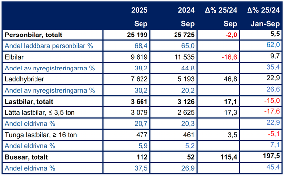 Under september nyregistrerades 3 079 lätta lastbilar, en ökning med 17 procent. Det innebär ett trendbrott efter 16 månader av nedgång. Hittills i år är segmentet dock ned 18 procent. Prognosen justeras ned från 38 000 till 35 000 fordon och andelen eldrivna från 25 till 23 procent, påverkat av en svag byggkonjunktur.