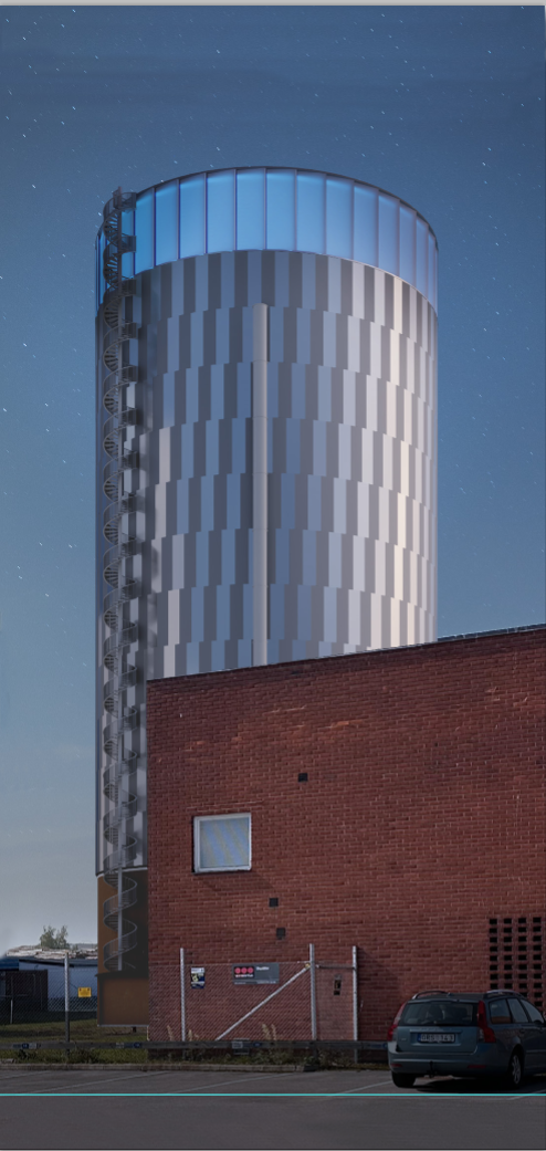 Tanken, som blir ett nytt inslag i stadens siluett, har gestaltats av Gatun Arkitekter och kläs i metall. Den placeras intill Åbyverket med god visuell koppling till E18/E20.