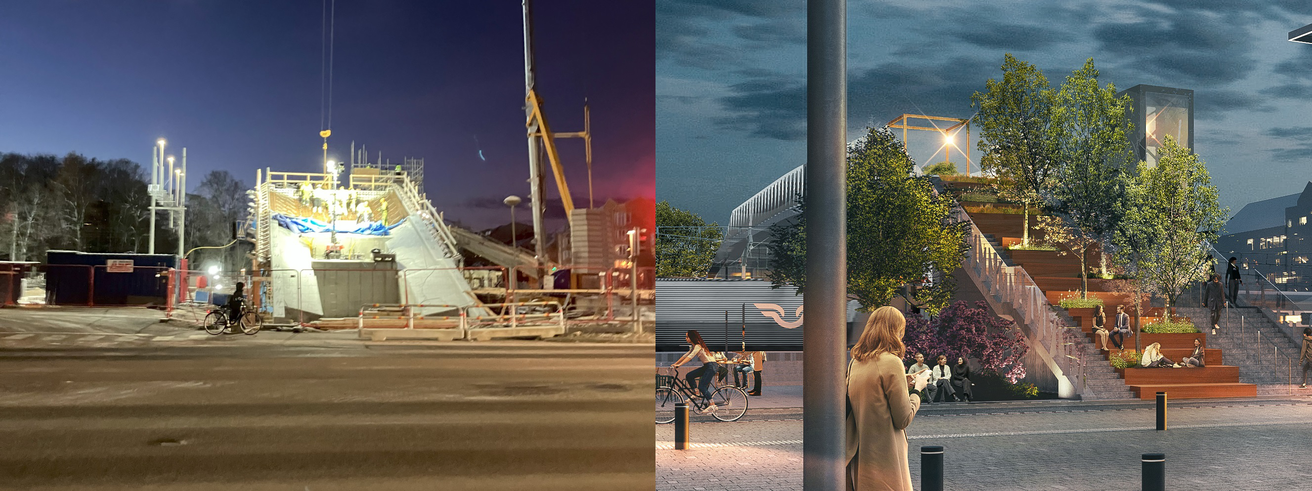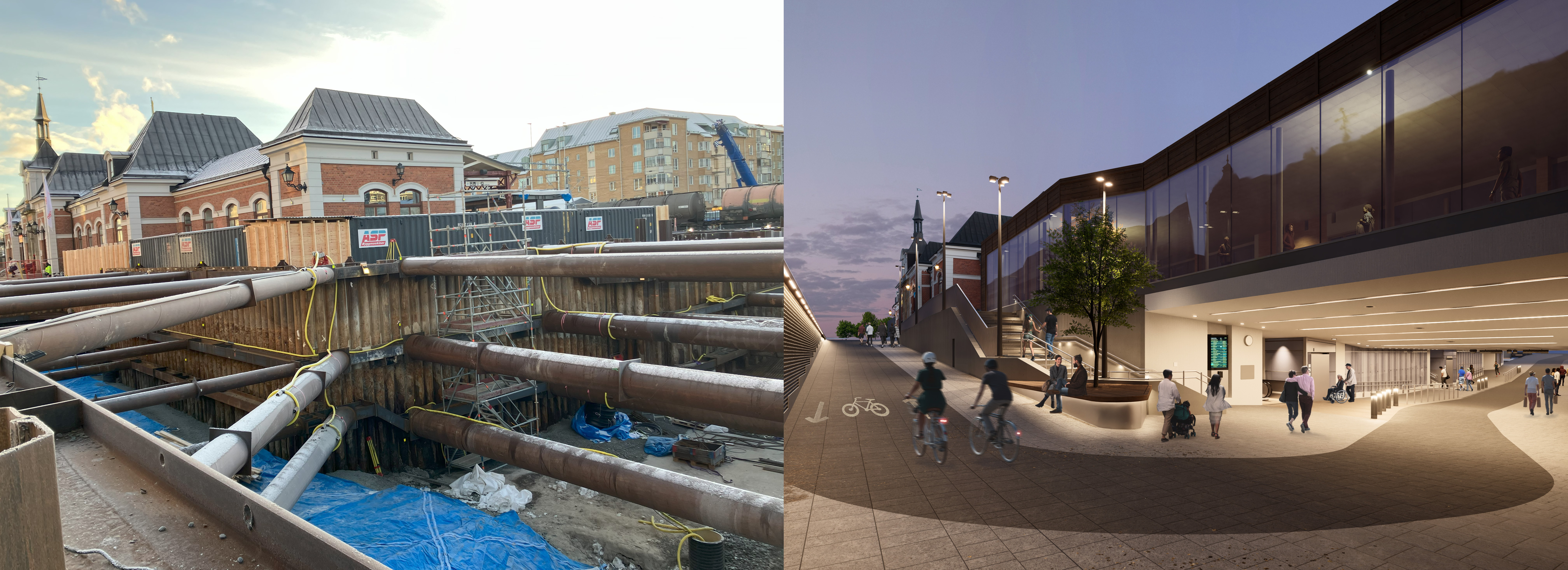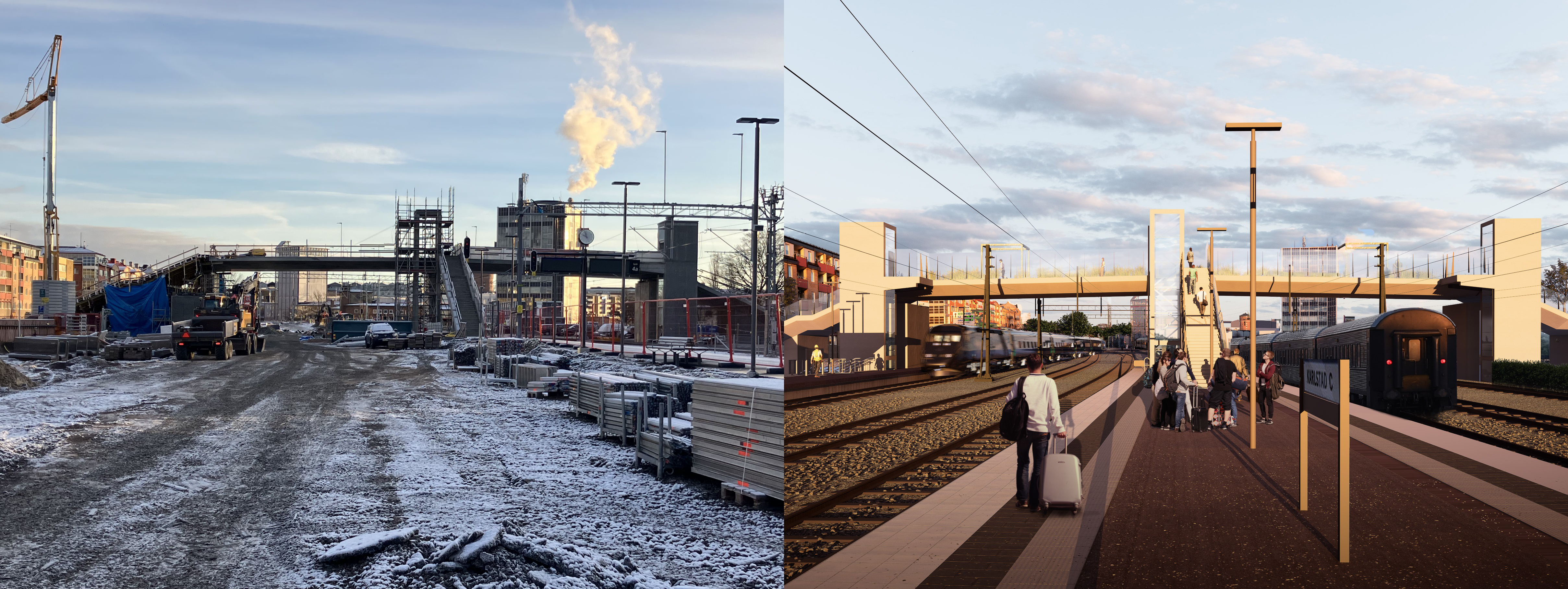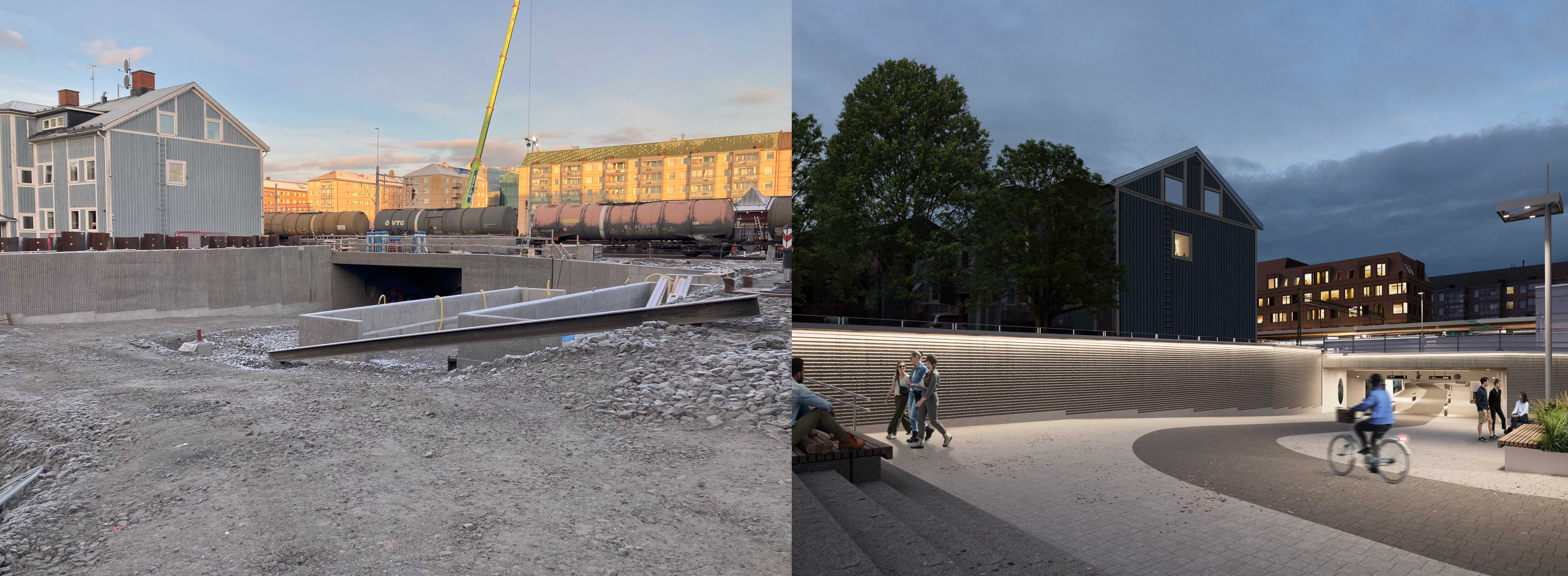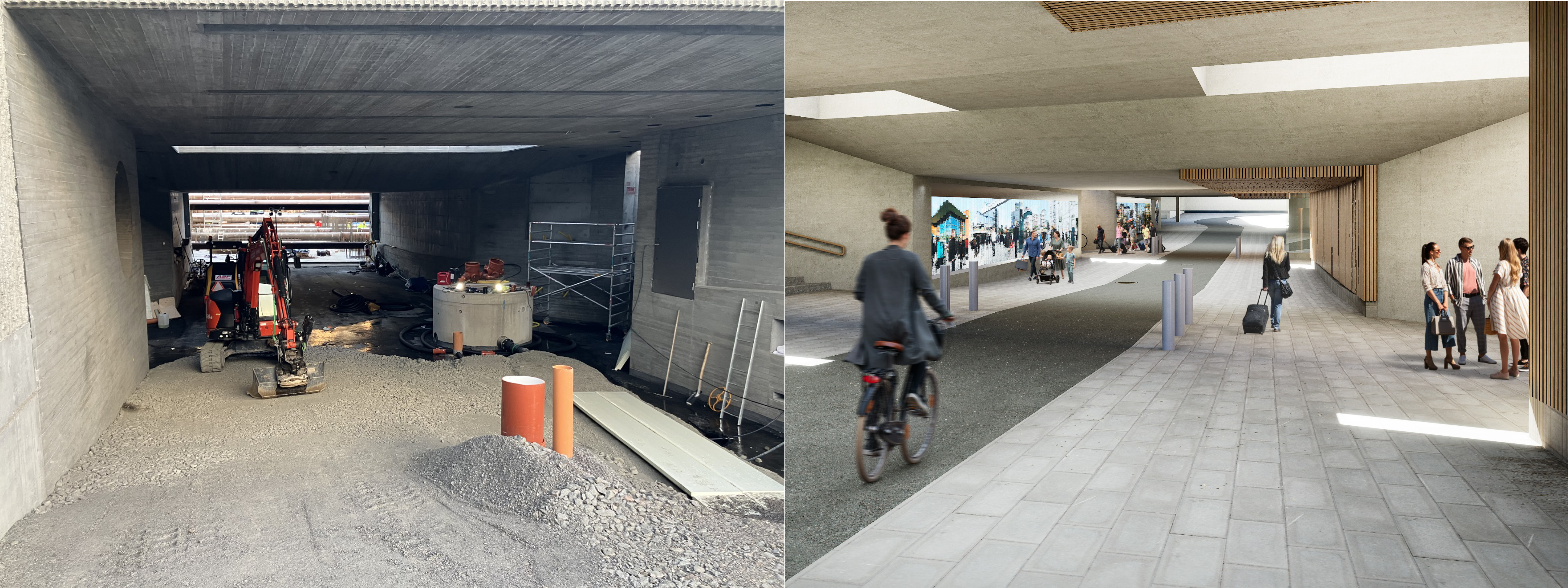 Till vänster syns den blivande norra entrén till Vikenpassagen under spåren i december 2024. Till höger en illustration som visar hur området kan komma att se ut när arbetet är färdigt. Foto: Trafikverket/Sweco