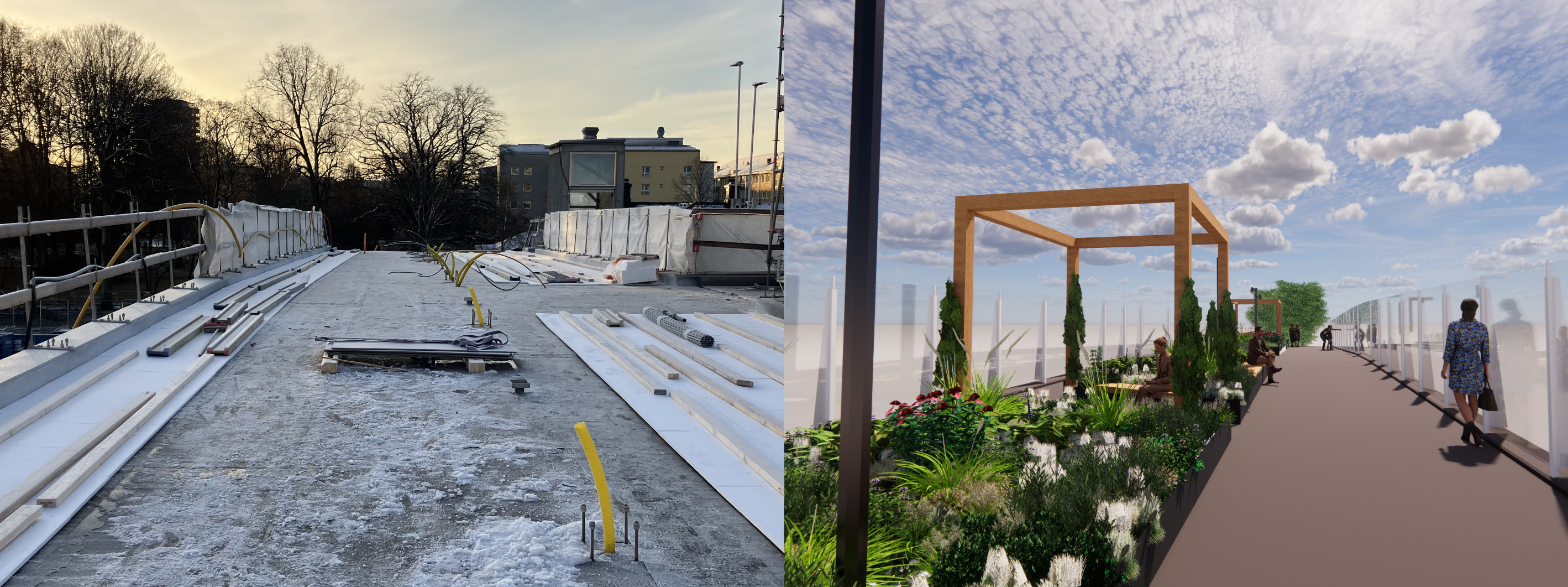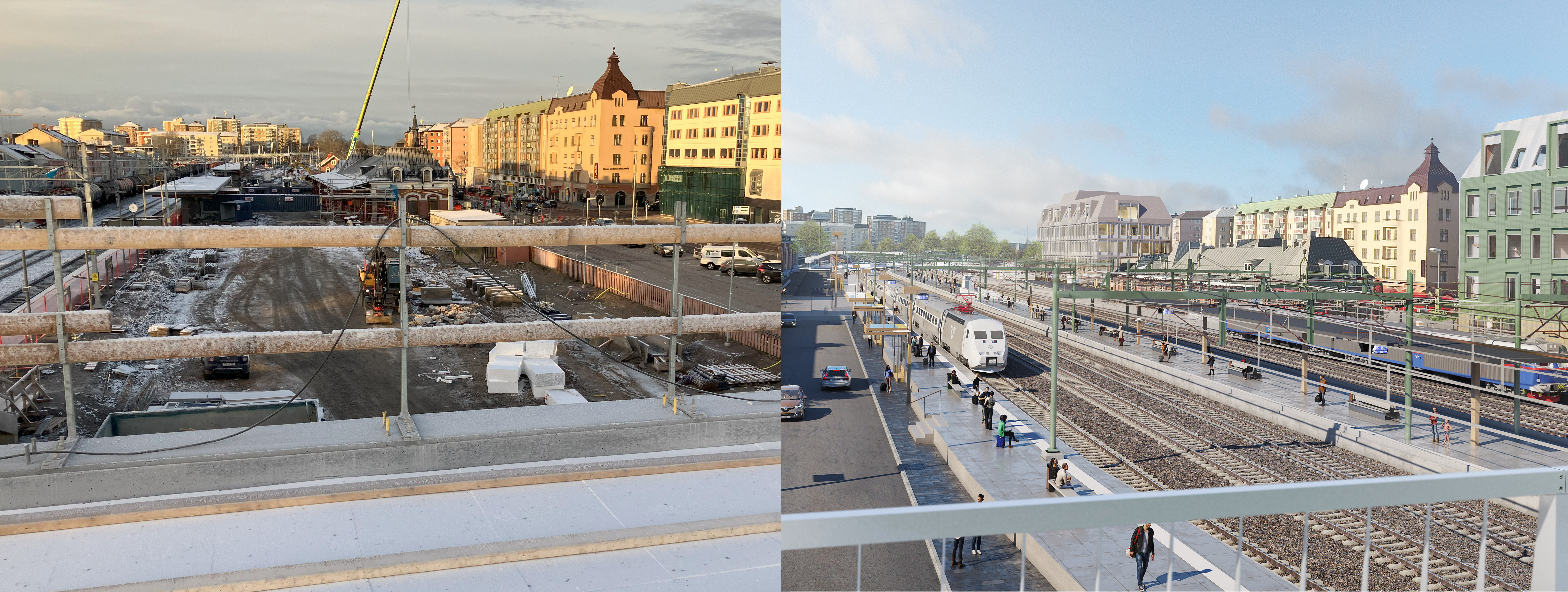 Till vänster syns bron Trädgårdslänken över spåren i december 2024, med vy mot öster. Till höger en illustration som visar hur området kan se ut när arbetet är färdigt. Foto: Trafikverket/Sweco