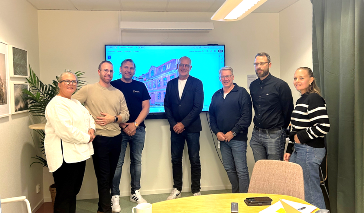 På bilden från vänster: Ulrika Ehrenholm, Robert Thörnlid, Robert Björn och Magnus Lorentzon, alla från T-Byggen, samt Anders Emilsson, Peter Andersson och Sandra Ingman från Uddevalla Kommun. Pressbild: T-Byggen Sverige AB