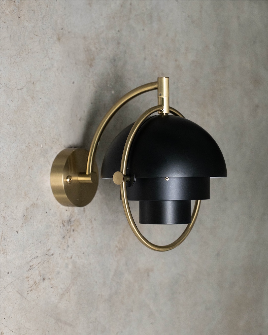 Multi-Lite Wall Lamp har en väggmonterad arm som kan svänga, vilket ger fler positioneringsmöjligheter. Den yttre armen som kopplar lampan till väggen kan roteras upp till 180 grader, vilket gör att lampan kan vinklas på olika sätt. Detta gör det möjligt att placera lampskärmen så att den antingen hänger ovanifrån eller vilar på armen, och därmed styra ljuset och rummets fokus.