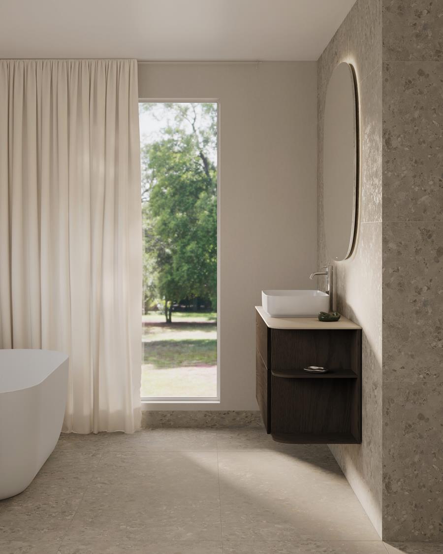 Badrummet 2026 inspireras av naturens material och taktila kvaliteter, med fokus på material som åldras och känns levande. Rundade former ersätter ofta skarpa linjer för att skapa ett mjukare flöde i rummet.