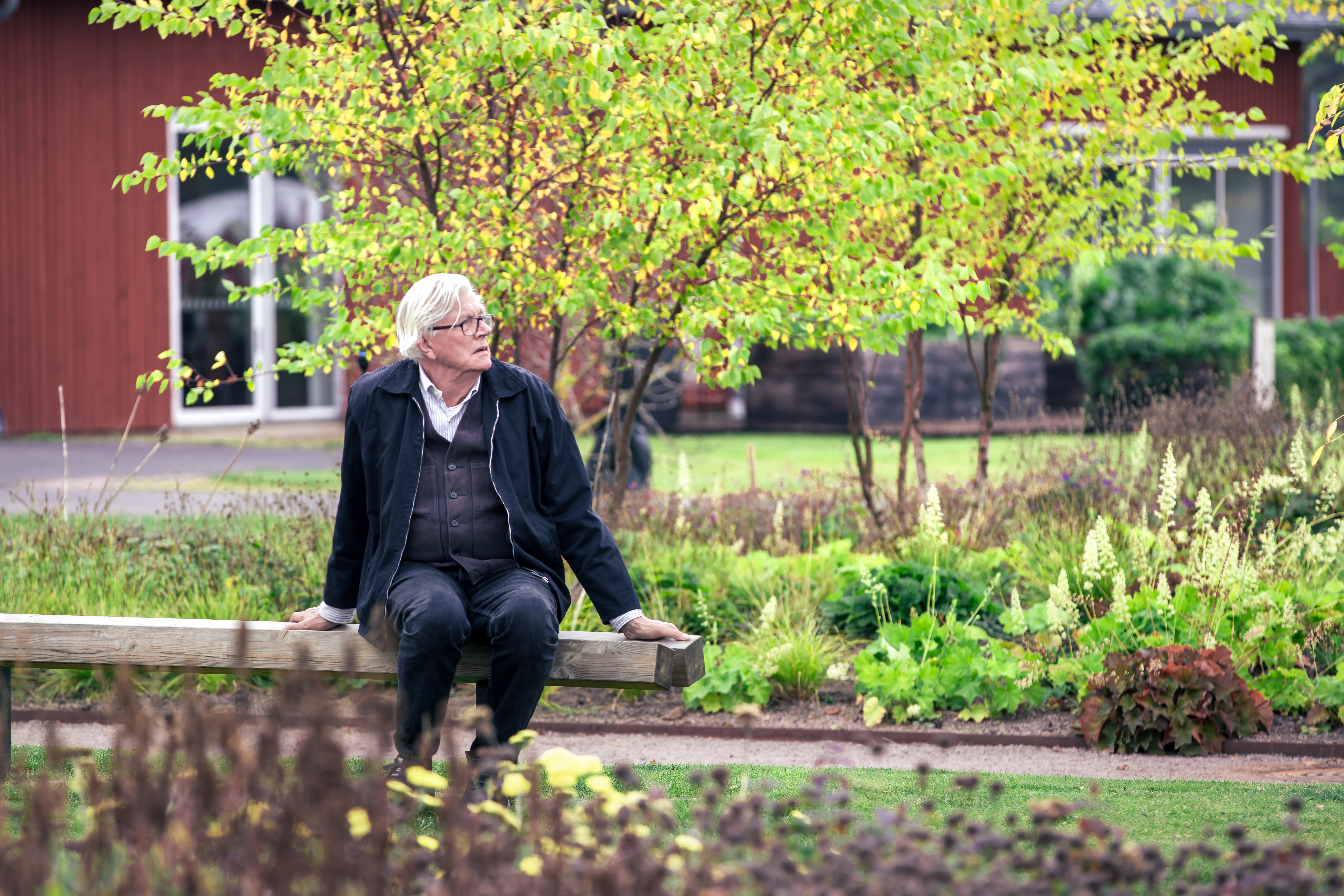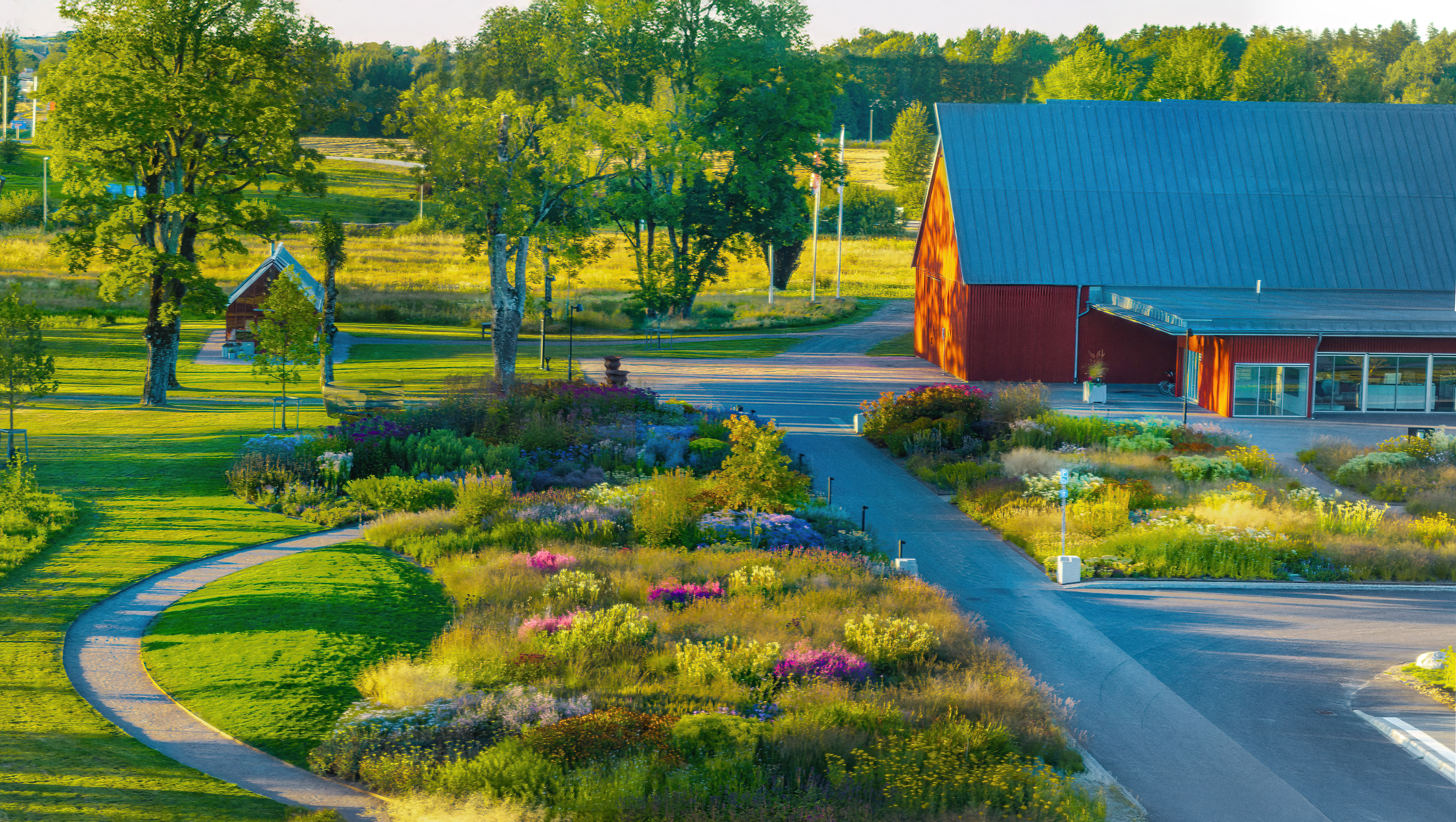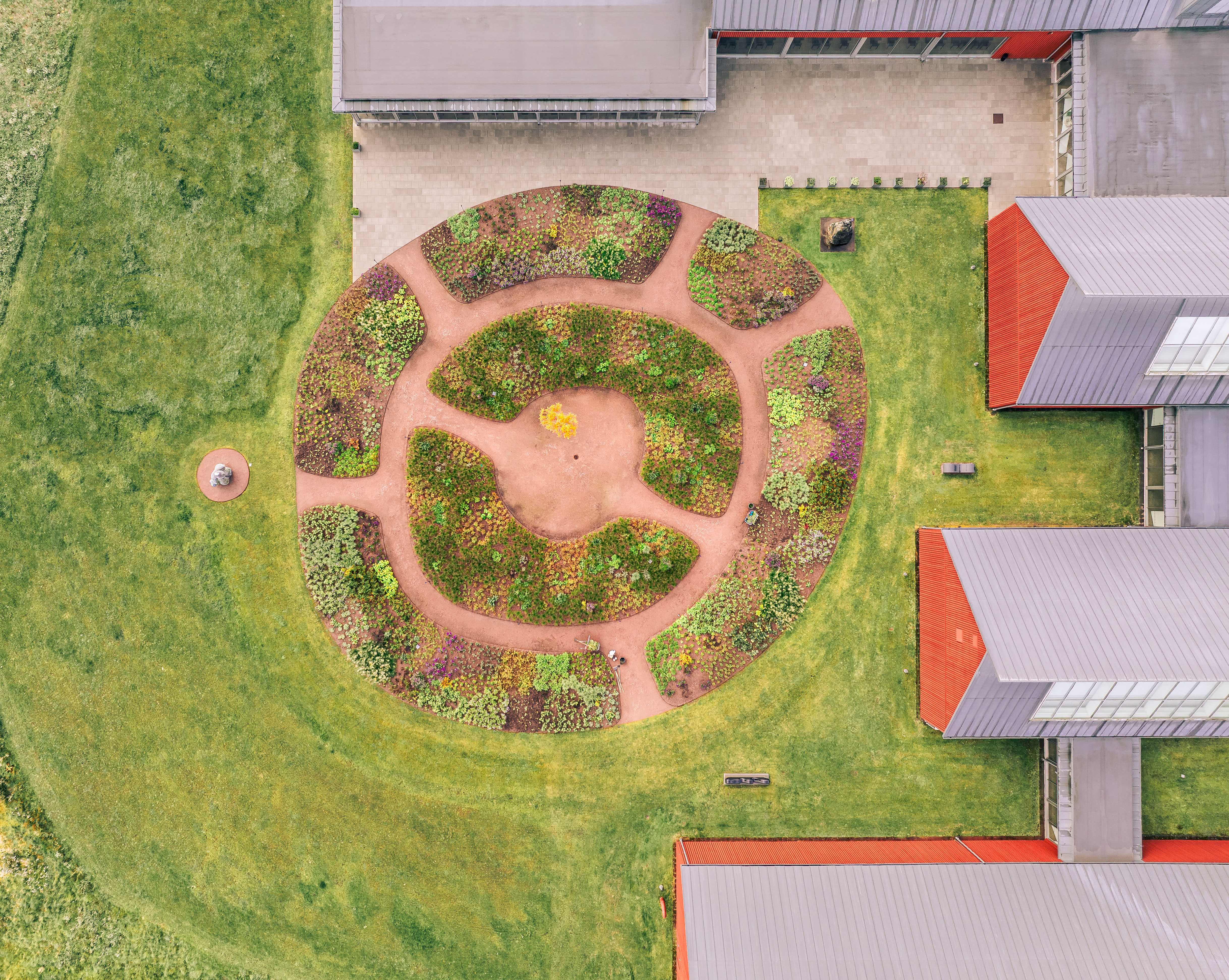 Trädgården omger de röda byggnaderna och påverkar upplevelsen redan vid ankomsten. Växter och konst samspelar under årets skiftningar. Gångar och sittplatser gör området tillgängligt för alla.
