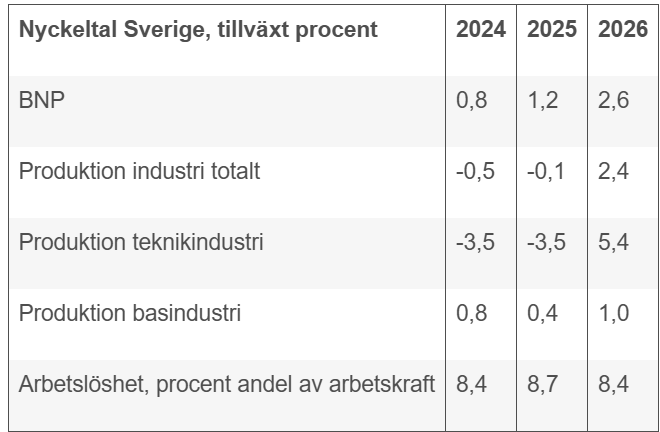 Den svenska BNP-tillväxten väntas bli 1,2 procent 2025 och 2,6 procent 2026.