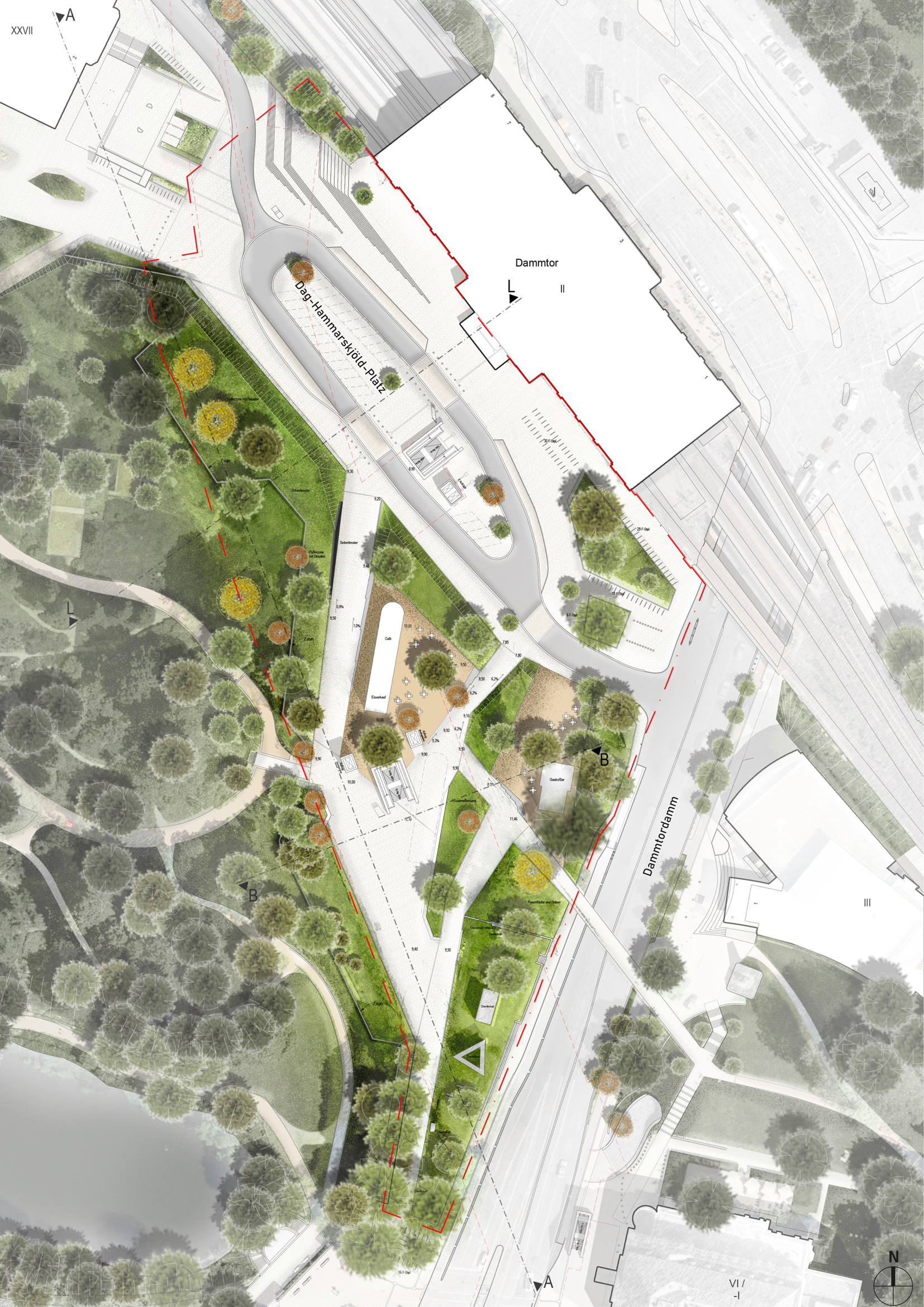 I Swecos uppdrag, där svenska och tyska experter samarbetar, omfattas såväl arkitektur och ljusdesign som landskapsplanering. Hållbarheten är central i den nya stationen, där befintliga byggkomponenter som kantstenar, beläggningar och sittmöbler återanvänds. Taket är ett framträdande designelement med sparsam materialanvändning och demonterbara element som möjliggör återbruk och minimerar avfall.