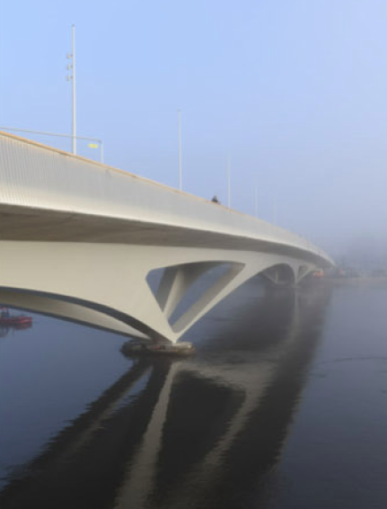 Bron är 260 meter lång och består av åtta sammanhängande spann som sträcker sig över både älv och järnväg. De skrå stålbågarna samverkar med betongdäcket i en konstruktion som kombinerar teknisk noggrannhet med ett enkelt arkitektoniskt uttryck.