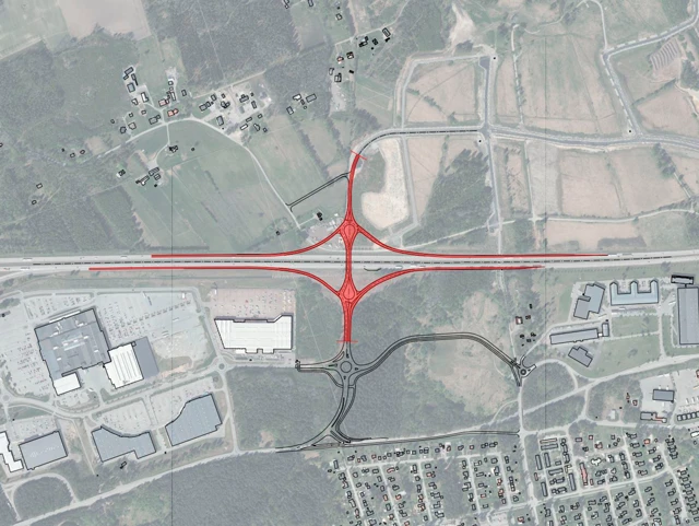 Den röda markeringen visar hur den nya trafikplatsen kommer vara utformad. Trafikplats Marieberg norra ansluter till det kommunala vägnätet intill områdena Palmbohult och Marieberg. Bild: Trafikverket