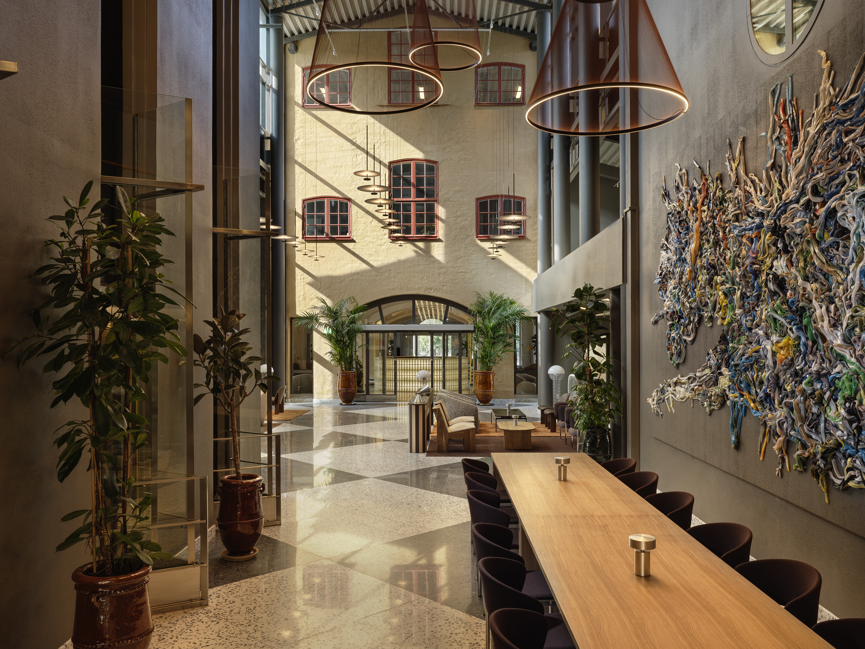 Det stora entréplanet har grafiska rutgolv i svart och vitt, betong, stålkonstruktioner och grå väggar kontrasteras av trämöbler, läder och textilier i chokladbrunt och varma toner. Ett designelement som drar blickarna till sig är den terrakottafärgade trappan i plåt som förbinder våningsplanen. Restaurangen intill har omslutande väggar i djup kulör och ett tak som veckar sig som en solfjäder. Möblerna går i ek och mossgrönt – en färgskala som för tankarna till landskapet utanför.