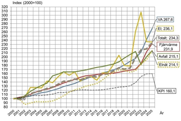 Både fjärrvärme och vatten och avlopp har ökat med näst högsta nivån på 30 år. Fjärrvärmen har ökat med 9,2 procent och VA med 10,7 procent. Även avfallet har ökat med 7,3 procent, och elnätsavgifterna med 10,6 procent.