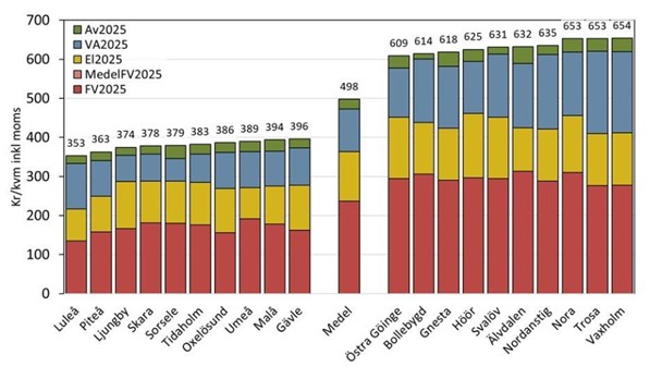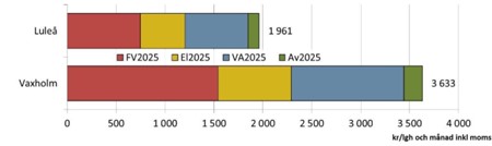 Kostnaderna varierar kraftigt mellan kommunerna och skillnaderna fortsätter att öka. Billigast är det att bo i Luleå där nyttigheterna kostar 1 961 kronor per lägenhet och månad. Dyrast är Vaxholm med 3 633 kronor per månad – hela 85 procent dyrare än i Luleå.