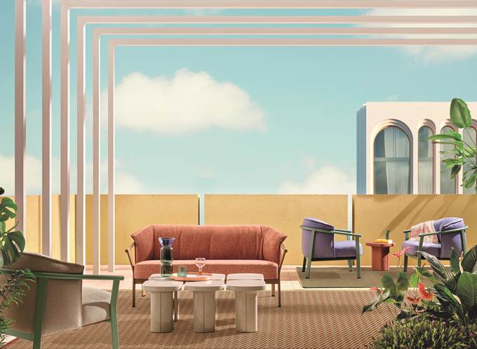 Värmefärgade toner inspirerade av jordens färger präglar miljön och bjuder in besökare att utforska olika inomhus- och utomhusmiljöer. Lamorisse outdoor Lounge & Sofa, designad av Cazzaniga Mandelli Pagliarulo, skapar en öppen sittgrupp utomhus. Denna loungefåtölj och tvåsitssoffa har en enkel ram kombinerad med mjuka kuddar. I samma miljö finns även Caementum-bord i ett stycke betong, designade av Marco Merendi & Diego Vencato, i olivgrön och brun finish. På borden står den uppladdningsbara bordslampan Filicudi, designad av Andrea Pedrali, med kompakt form och enkel stil. Mattan Twiny, designad av DWA Design Studio, lägger till en modern detalj med två olika mönster i twill.