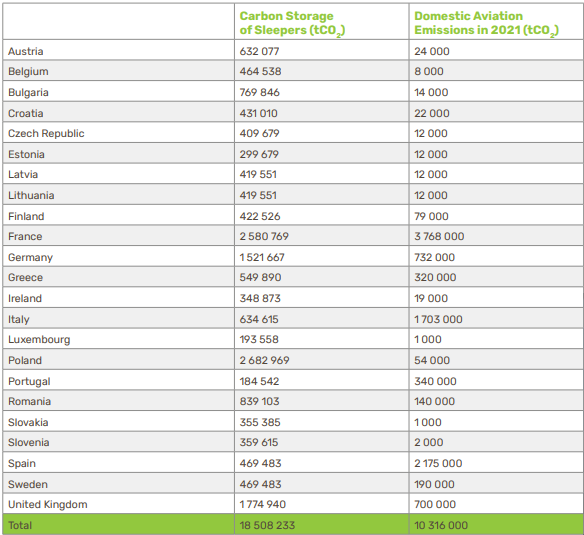 Genom träsliprars förmåga att lagra koldioxid genom produktens livscykel så lagras ungefär 21,9 miljoner ton koldioxidekvivalenter (CO2e) vid varje given tidpunkt, bara på dagens befintliga träsliprar installerade i Europas järnvägsnät. Från 2023 års rapport från Europeiska miljöbyrån så har 23 av dessa länder sammanlagda utsläpp från deras inrikesflyg om 10,3 miljoner ton CO2e medan de har en lagring av koldioxid i deras träsliprar om 18,5 miljoner CO2e. Detta visar på en enorm möjlighet i att använda mer träsliprar.