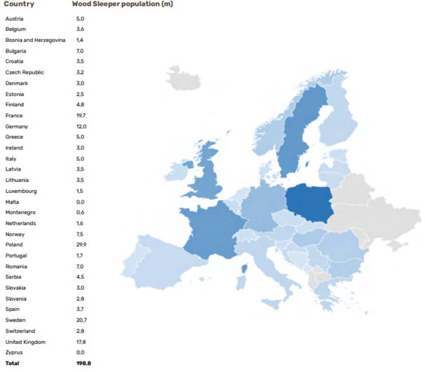 Branschföreningen EWPA (European Wood Protection Association) har kartlagt mängden träsliprar i fält i europeiska länder och kommit fram till att nära 200 miljoner träsliprar ligger i det europeiska järnvägsnätet.