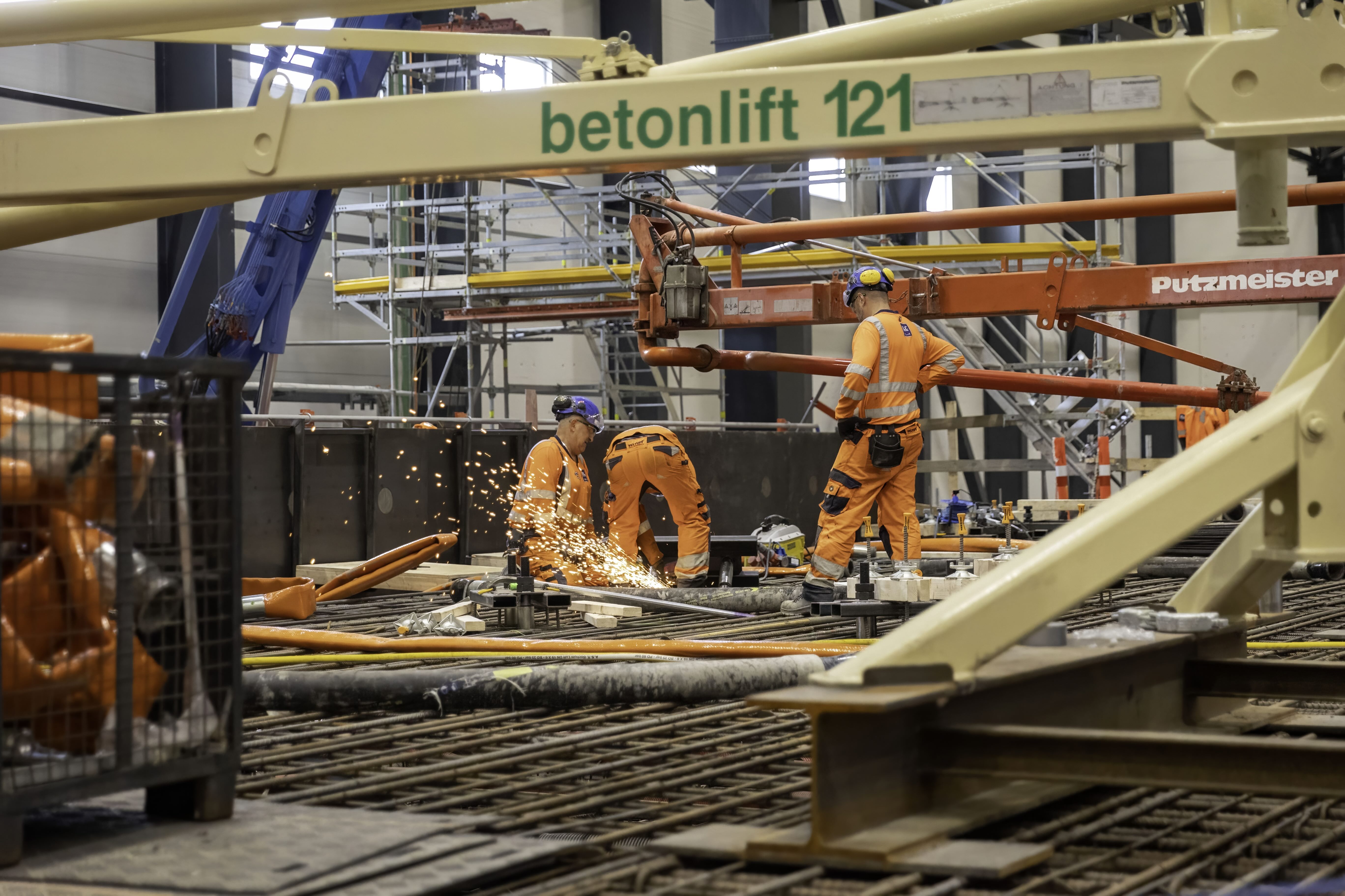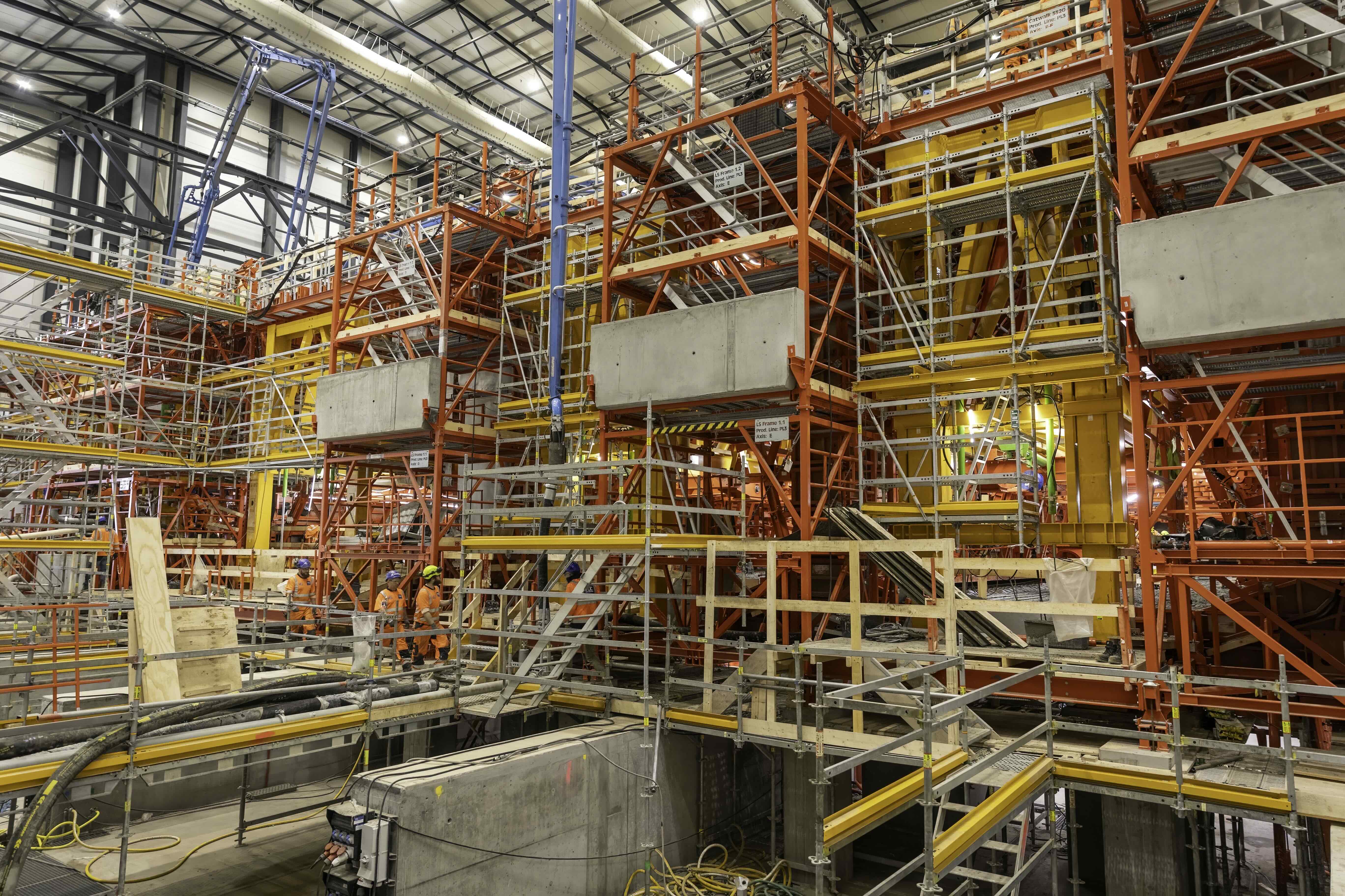 I panelfabriken sker monteringen av tusentals ton armeringsjärn som monteras till stora gallerstrukturer som utgör skelettet i tunnelelementen.