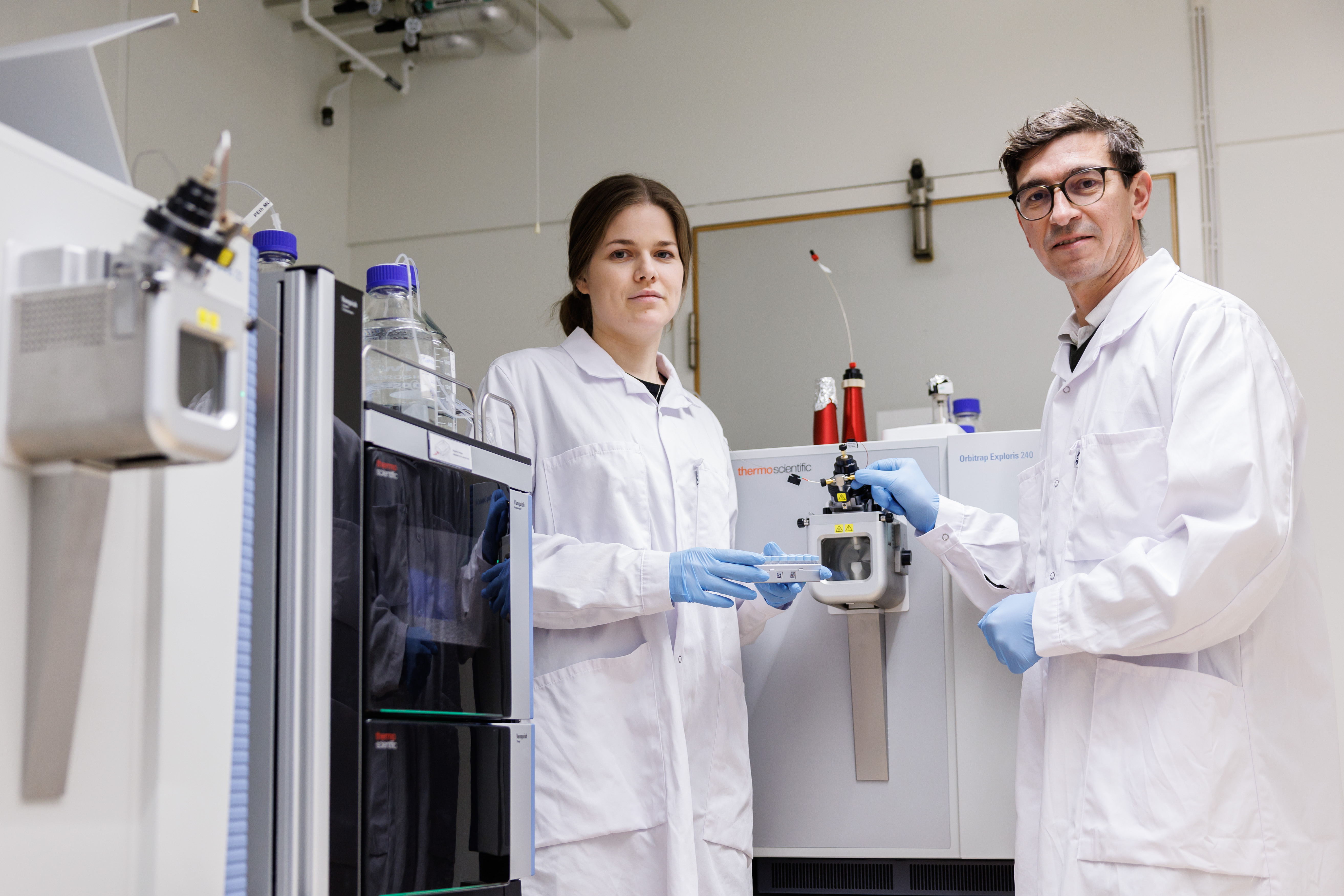 Aina Vaivade och Kim Kultima har undersökt halterna av vanliga miljöföroreningar i blod hos personer med MS med hjälp av en masspektrometer (bilden). Foto: Tobias Sterner/Uppsala universitet