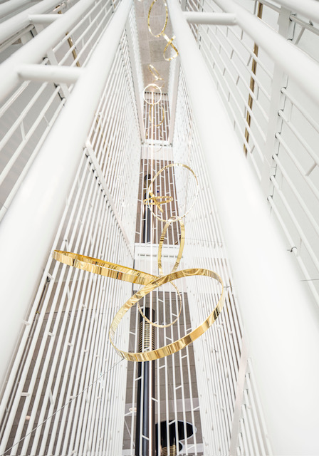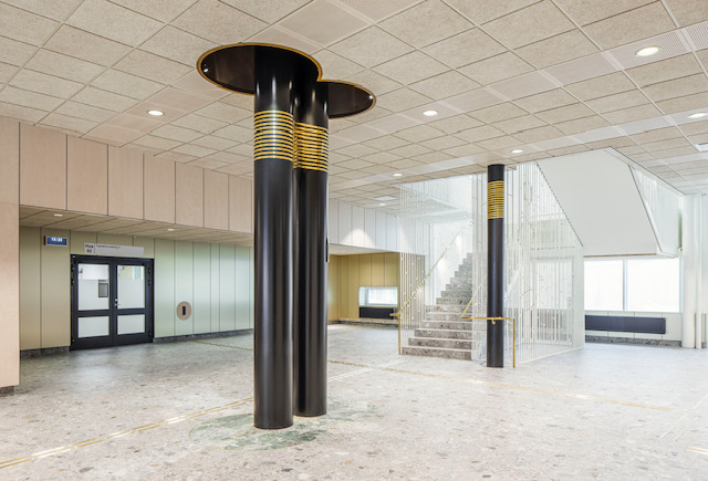 Infällt i golvet runt pelarna finns en ”tjärn” av kolmårdsmarmor och trapphusens räcken är utformade som en vertikal skog, säger Christian Johannesson. I trapphuset finns konstnärlig utsmyckning i form av stora mässingsringar utformade av konstnären Jukka Värelä.