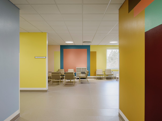 I Nya psykiatrisjukhuset i Kalmar leder konstnärerna Filippa Arrias och Britta Kjellgren Jägers kulörta geometriska former, i bland annat gult och rött, besökaren vidare upp i huset. Det är ett tema som även återkommer i väntrummen.