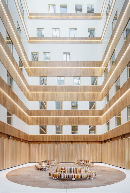–Tanken var att förmedla en varm och välkomnande känsla som inte direkt påminner om ett sjukhus i entrén, där vi har strävat efter att tona ner den kliniska estetiken. I båda sjukhusen har vi strävat efter att anknyta till den värme som entréområdet utstrålar även på vårdavdelningarna, exempelvis i form av trälaminat i dörrmiljöerna, säger Christian Johannesson, arkitekt på Krook & Tjäder.