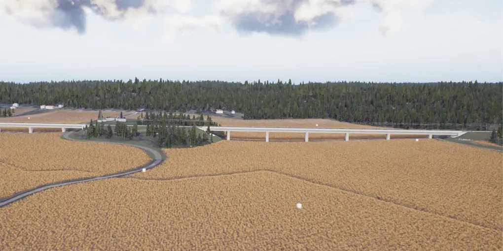 Passage på landskapsbro över Tunsättersbäckens dalgång, vy från söder. Illustrationen är hämtad ur VR-modellen, en digital modell av järnvägsanläggningen och dess omgivning. Bilden är preliminär och visar inte exakt hur den färdiga anläggningen kommer att utformas. Illustration: Trafikverket