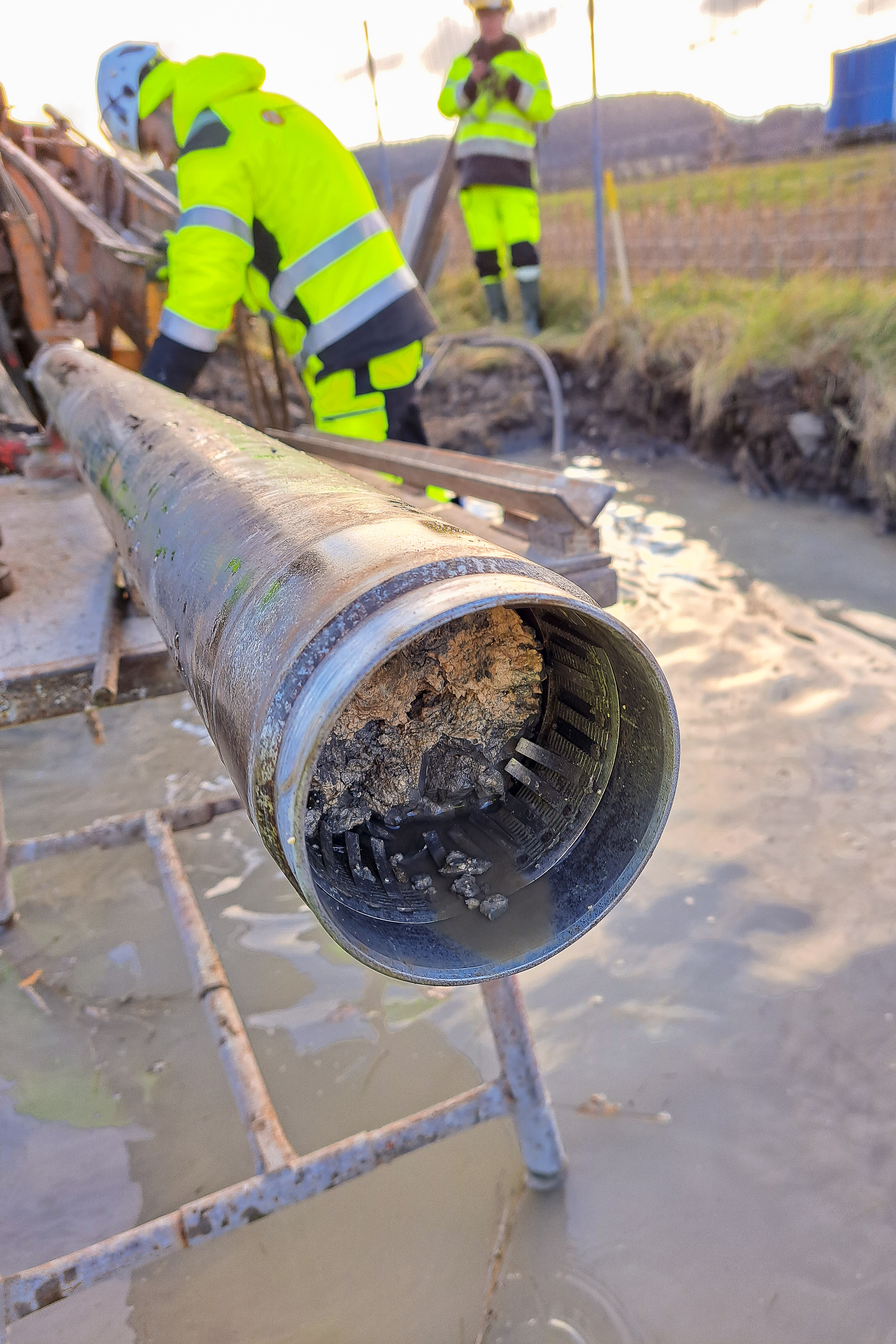 Närbild på änden av innerröret i S-Geobor-utrustningen, med en borrkärna från en KC-pelare i Håby.