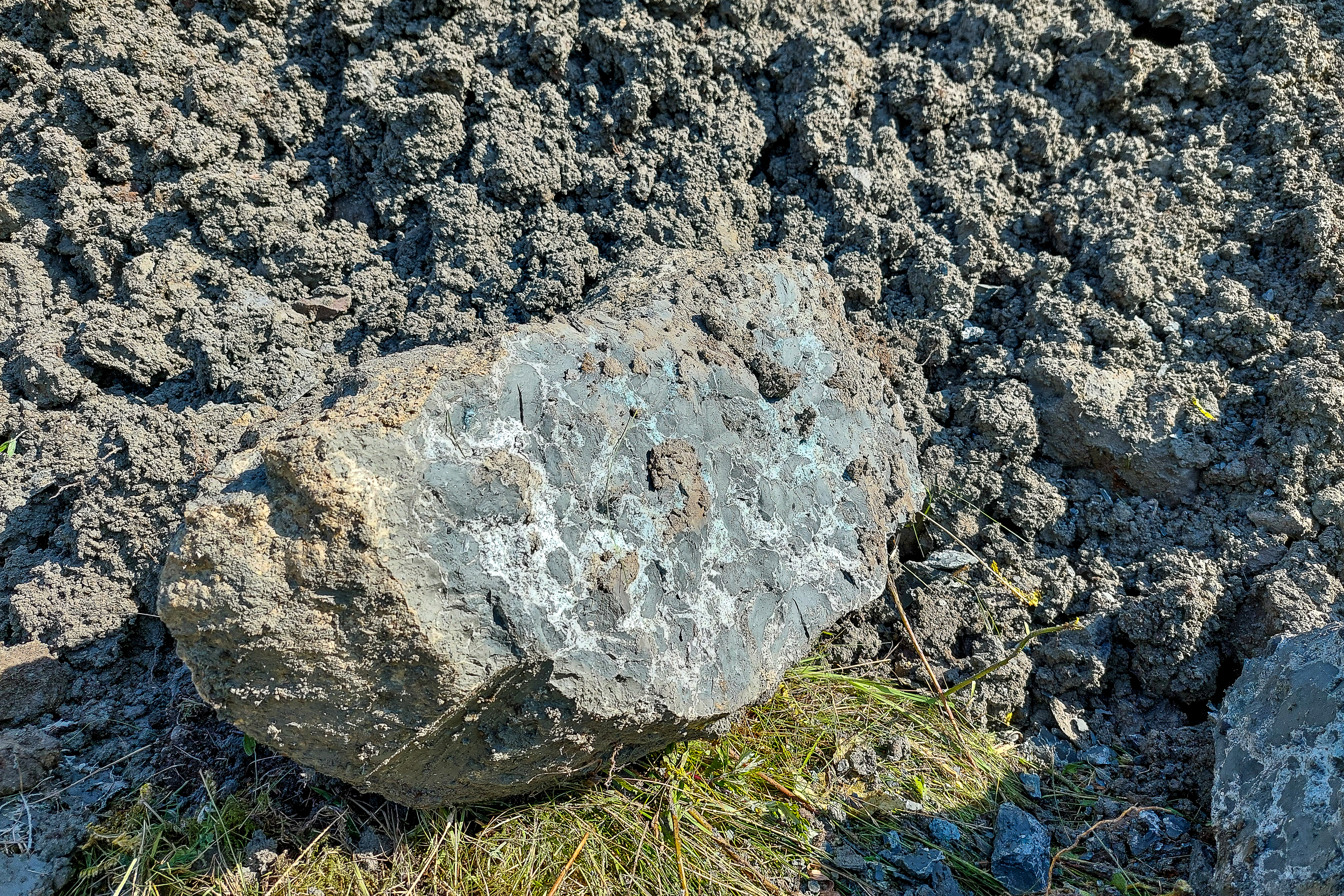 Foto på en bit av en pelare som bröts av då arbetsytan schaktades fram i Kåhög. De ljusa stråken i biten är bindemedel av kalk och cement.