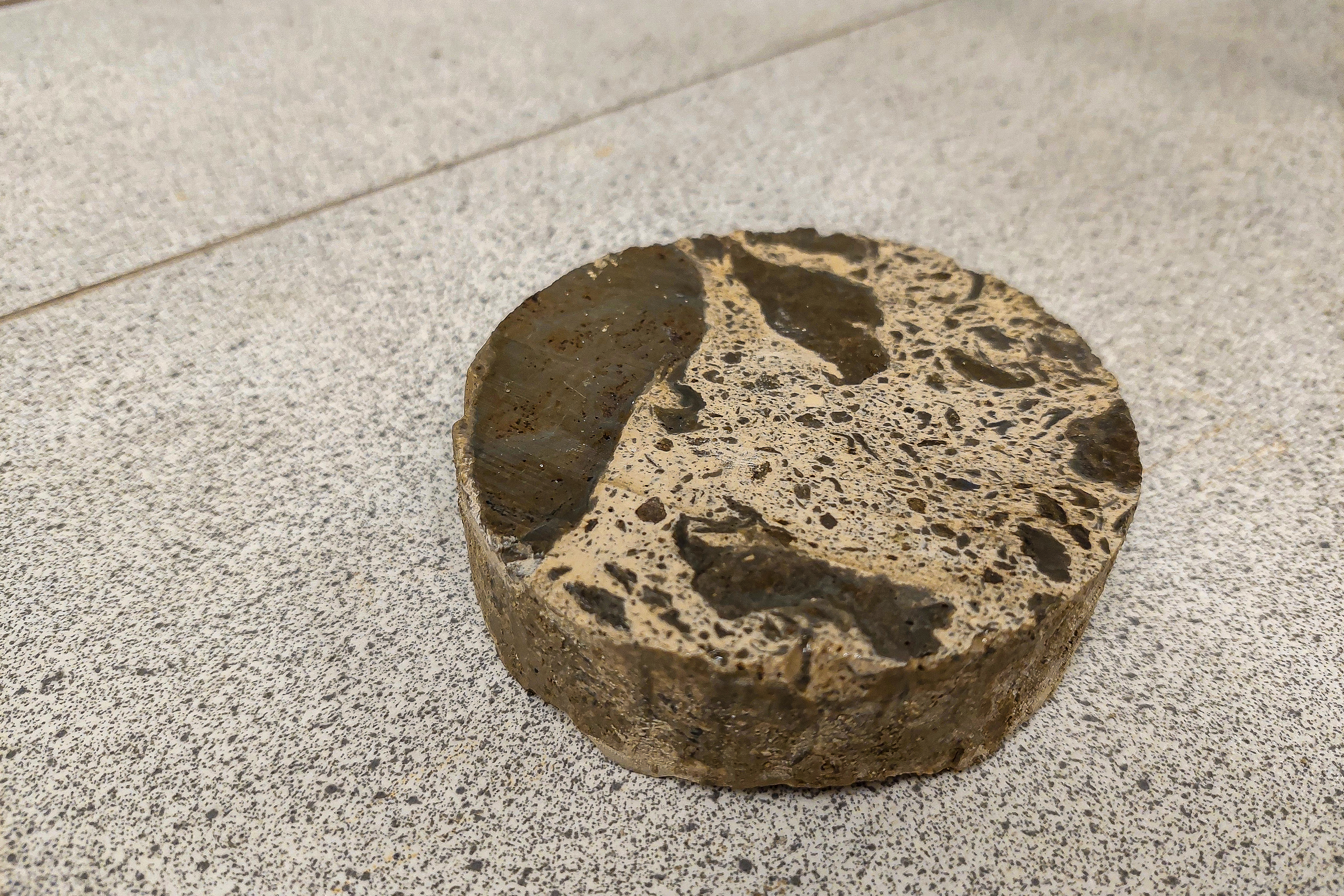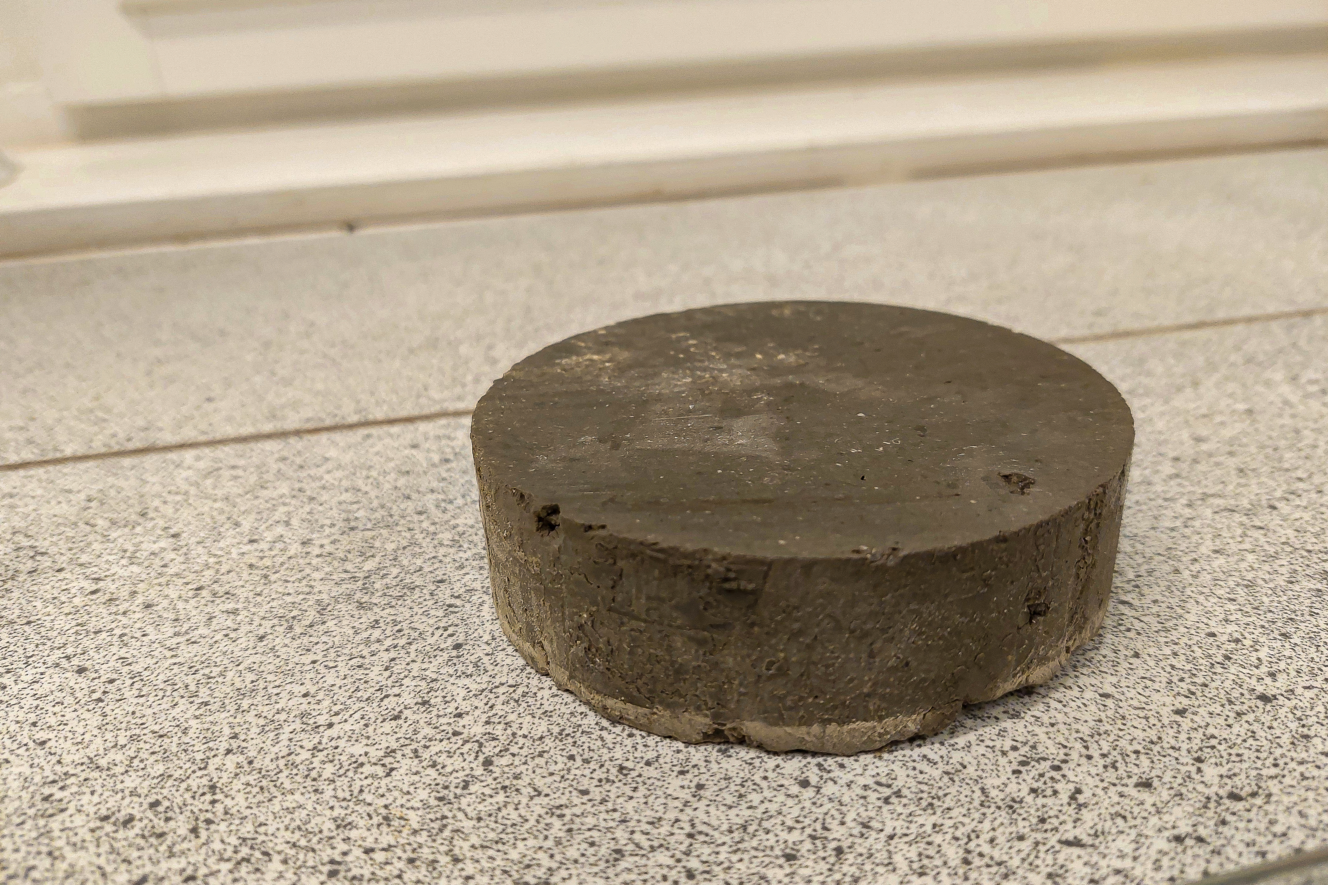 Prov utsågat från ett kärnborrprov i lokal Håby, ca 75 cm under arbetsytan. Provet är 30 mm högt och ca 100 mm i diameter.
