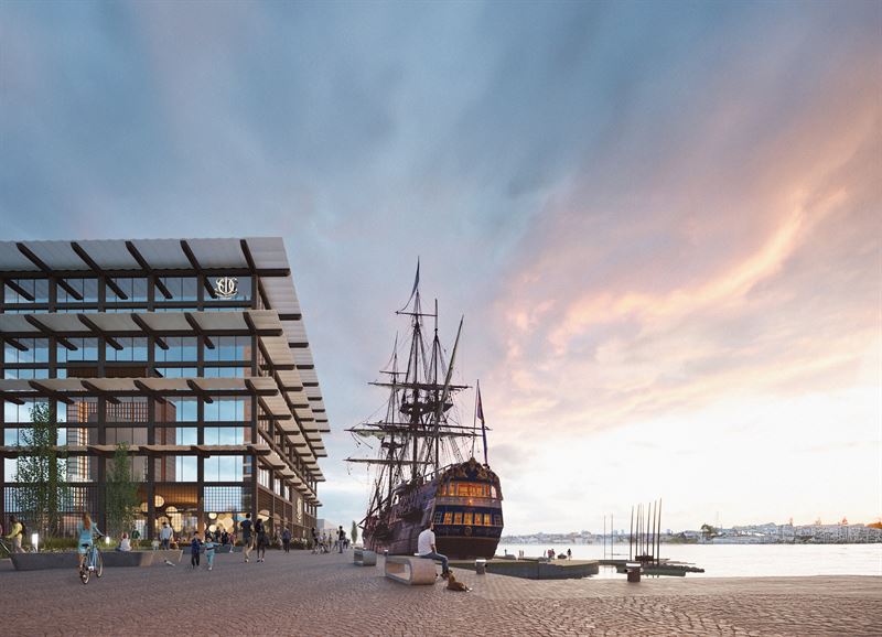 I anslutning till skeppet och upplevelsecentret planeras även för restaurang samt kontorsytor för verksamheter relaterade till sjöfart, handel och logistik. Bild: R-Studio, visionsbild.