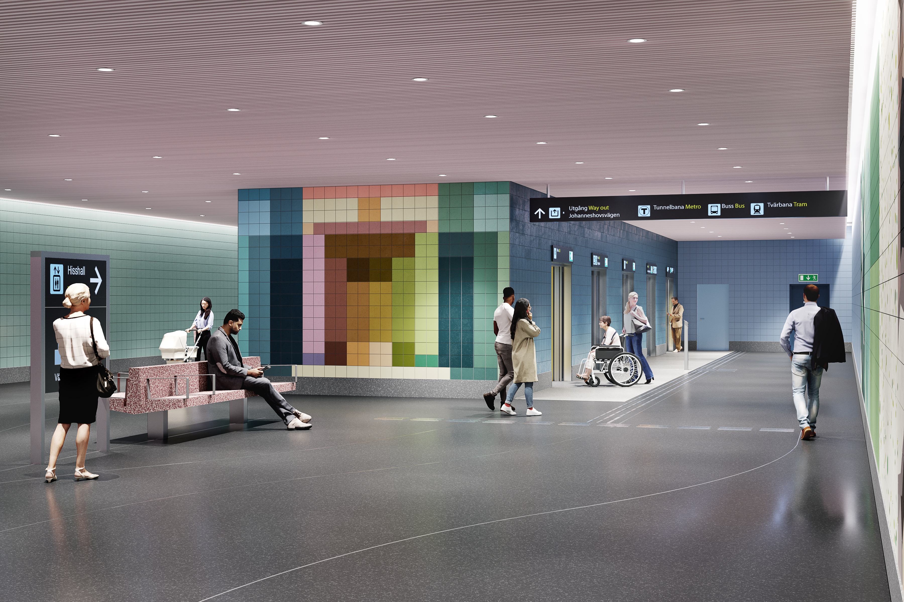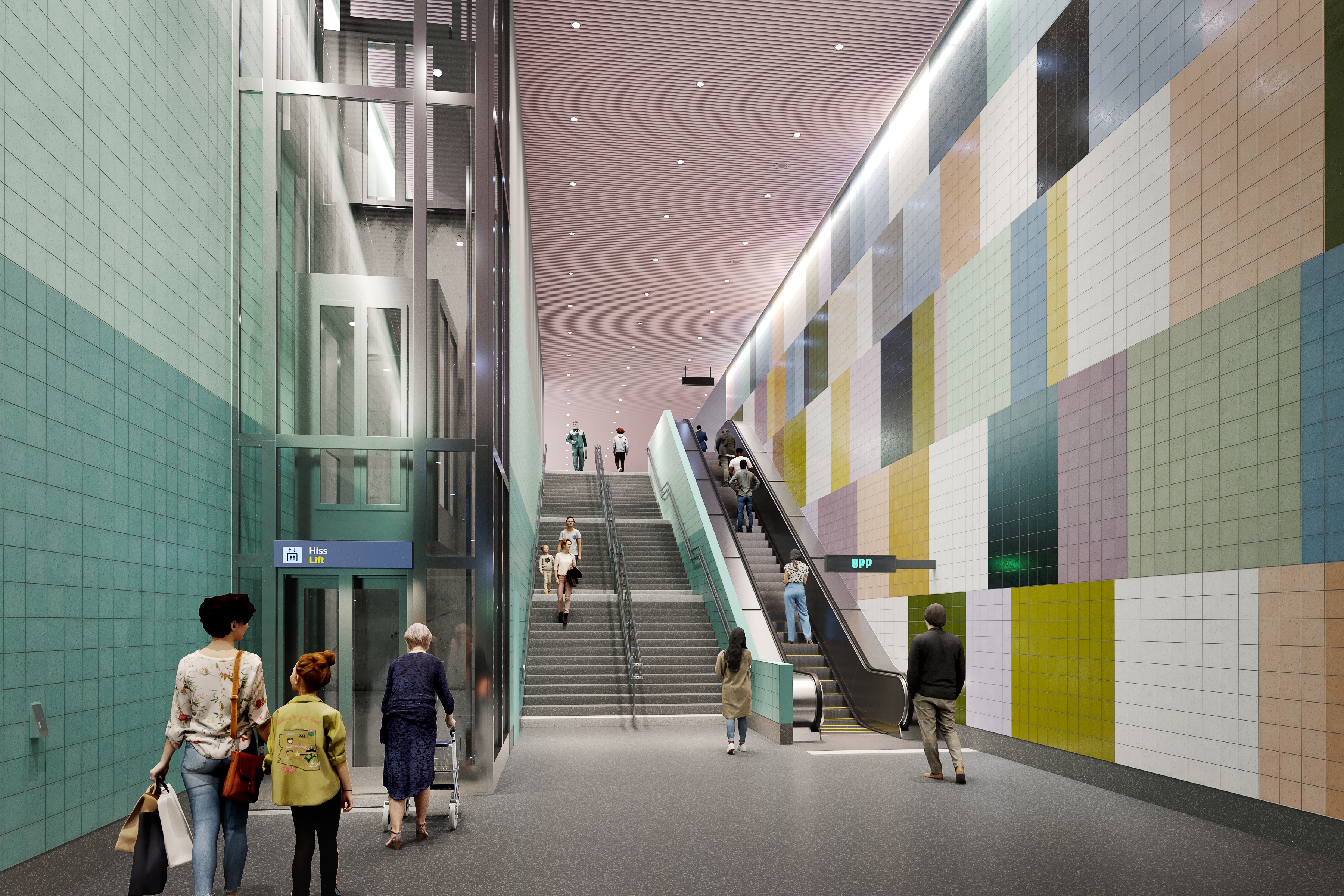 Förbindelsen mellan biljetthallen och plattformen sker med hissar, medan uppgången mot Mårtensdal får rulltrappor och hissar.