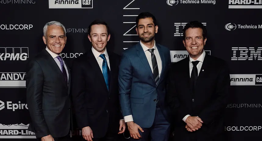 ANDRITZ prisas för AI-styrsystem i internationell gruvtävling. Andritz -team från vänster: David Garofalo, vd Goldcorp, Arthur Gooch, innovationschef ANDRITZ, Sohail Nazari, ansvarig för digital transformation vid ANDRITZ, samt konferencier Rick Mercer. Foto: Andritz Ag